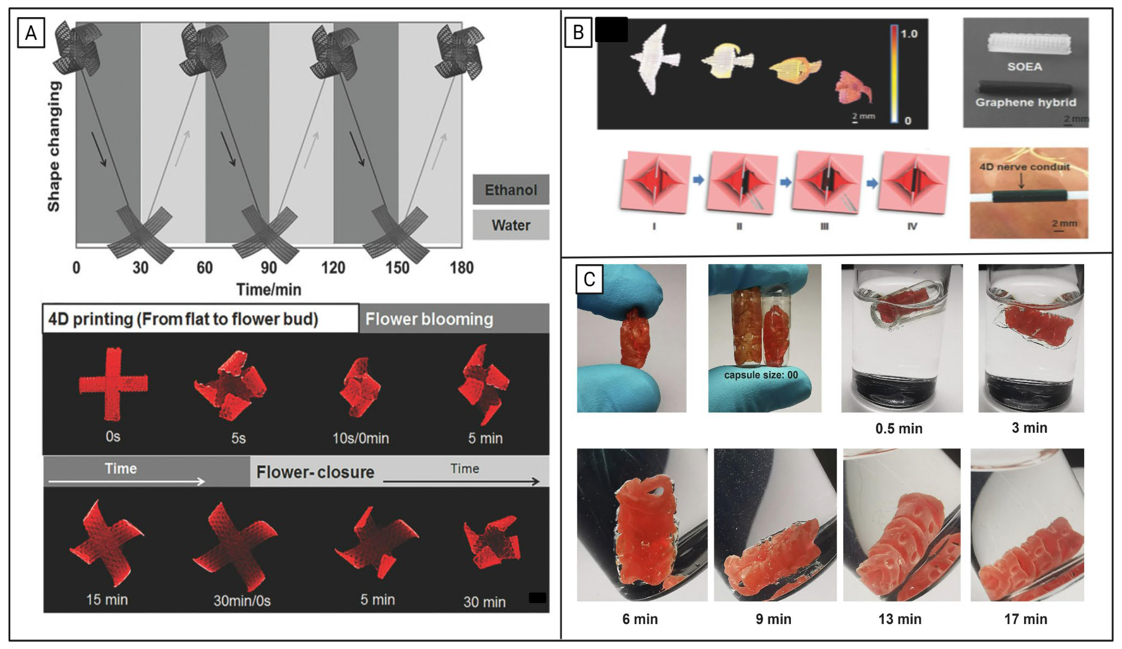 | Key Regulatory Concerns | Biocompatibility (ISO 10993 [122,168,190,191] series) Mechanical reliability Sterilization validation 3D printing reproducibility Degradability/product safety | All 3D concerns in addition to: Predictability and repeatability of in vivo actuation Stimulus safety (thermal, pH, light etc.) Long-term actuation reliability and fatigue under cyclic physiological conditions Risk of unintended transformation Potential for dynamic shape recovery affecting surrounding tissue/organs | [189] |