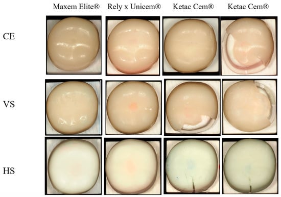 Post-fracture surface appearance of CRP crowns cemented with three luting agents. CE = Cerasmart® 270; VS = VarseoSmile Crown Plus®; HS = Hassawat-01. Rows represent the crown materials ((top): CE; (middle): VS; (bottom): HS), and columns represent the cement types (Maxcem Elite®, RelyX Unicem®, and two representative Ketac Cem® specimens). Each image illustrates the characteristic failure pattern for that material–cement combination. Resin-cemented groups (Maxcem Elite® and RelyX Unicem®) generally showed minimal surface disruption, whereas Ketac Cem® frequently produced visible crack lines, surface chipping, and cohesive cement remnants.