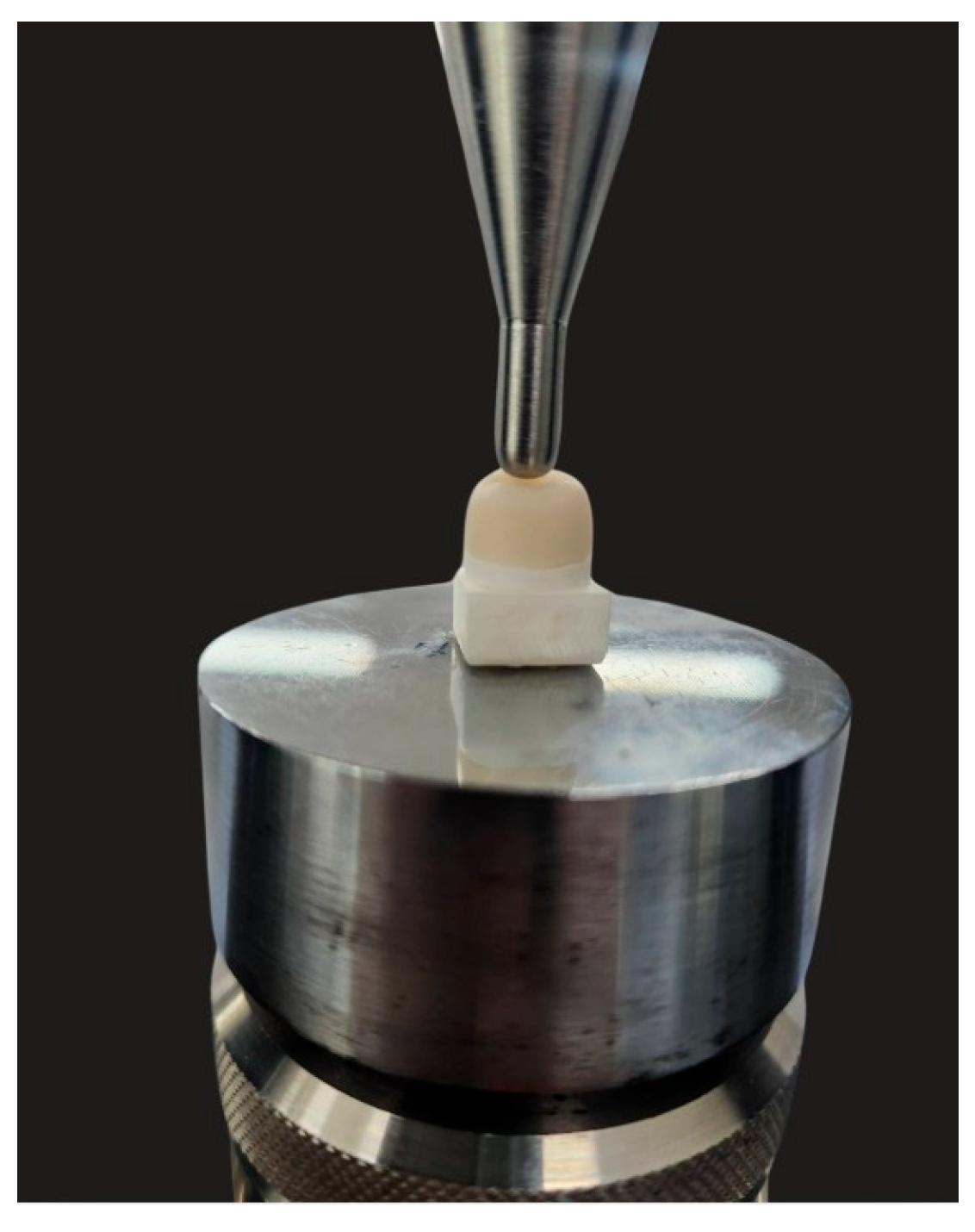 Fracture testing was performed using a universal testing machine (Shimadzu, Kyoto, Japan) with a 5 mm stainless steel ball positioned perpendicular to the central pit of each crown (Figure 4). A compressive load was applied at a crosshead speed of 1 mm/min until either a visible crack or a complete fracture occurred, and loading was terminated at a maximum of 2000 N [27]. For each specimen, the maximum fracture load and the corresponding failure mode were recorded. An intact specimen was defined as one with no visible crack or structural discontinuity. A crack was defined as a visible line or fissure within the material without complete separation, and a fracture was defined as catastrophic failure in which the crown separated into two or more distinct fragments.