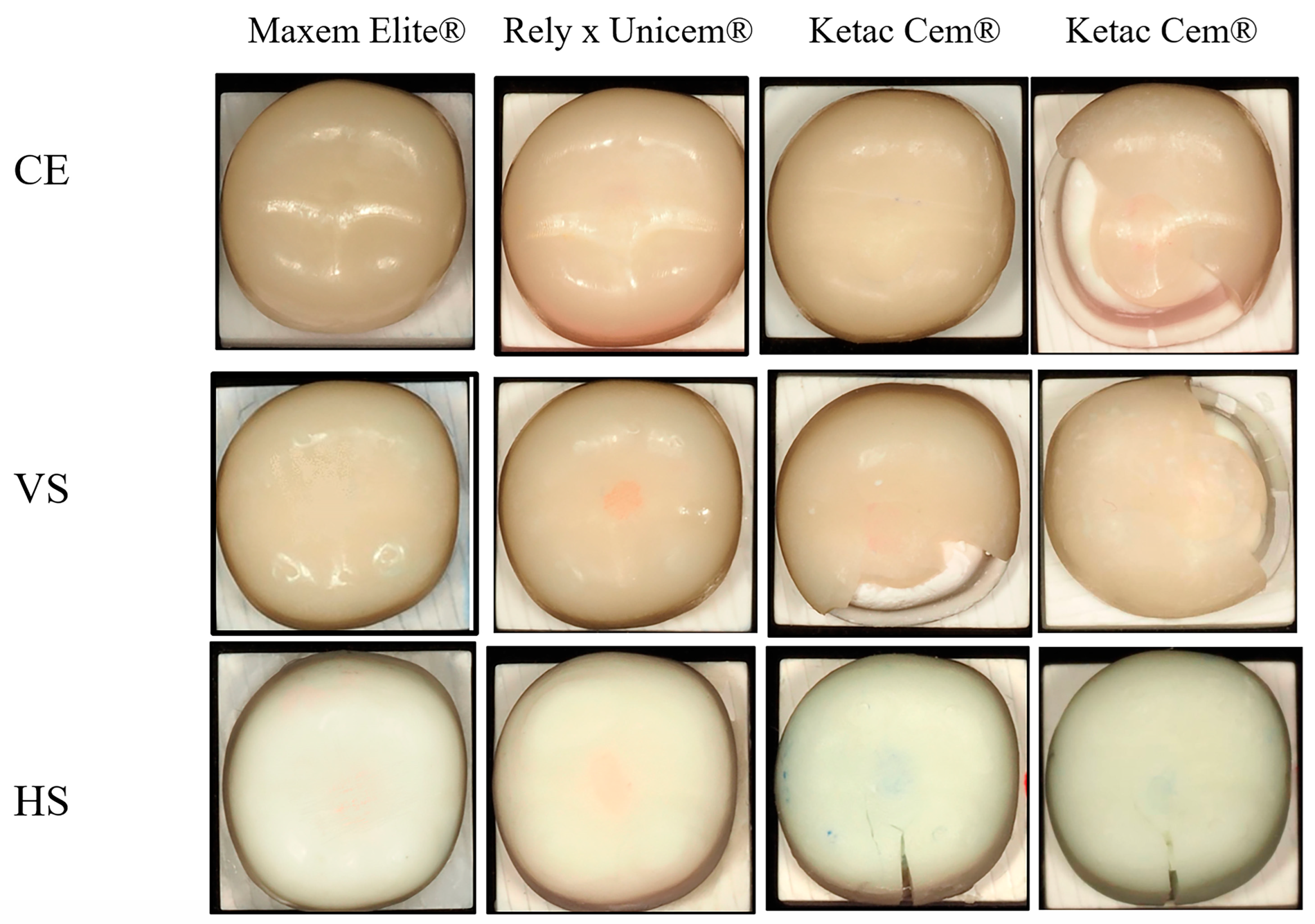 All crowns luted with Maxcem Elite® and RelyX Unicem® withstood the 2000 N load limit without visible cracks or fractures. In contrast, the Ketac groups exhibited lower fracture resistance and distinct failure modes. In the CE group, four of eleven crowns fractured slightly beyond 2000 N. Although mean values exceeded 2000 N, fractures occurred two to three seconds after the load limit was reached. VS-Ketac specimens showed seven fractures and four cracks (mean: 1795.2 ± 156.7 N), while all HS-Ketac specimens exhibited cracks without complete fracture (mean: 1732.6 ± 127.3 N) (Table 2). Representative failures are shown in Figure 5. The horizontal rows represent each ceramic material luted with different cements, whereas the vertical columns represent each ceramic material luted with the same cement. Due to the variation in fracture patterns among ceramics within the Ketac Cem® group, this group is presented in two vertical rows to clearly illustrate the differences.