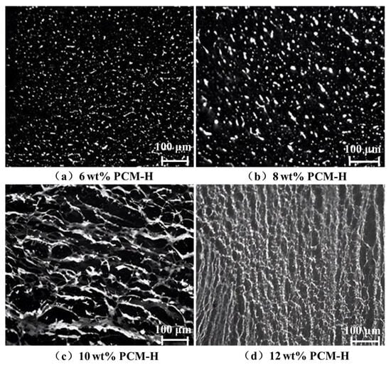 Microscopic dispersion behavior of different dosages of PCM-H. (a) 6 wt% PCM-H; (b) 8 wt% PCM-H; (c) 10 wt% PCM-H; (d) 12 wt% PCM-H.
