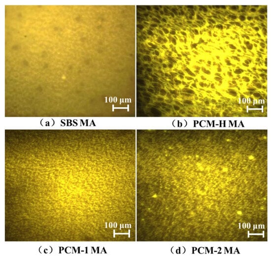 Using SBS MA as the base binder, three polyolefin composite modifiers (PCM-H, PCM-1, and PCM-2) were each added at a dosage of 10 wt% to prepare three distinct modified asphalts, designated PCM-H MA, PCM-1 MA, and PCM-2 MA. The morphological distribution of the SBS MA and the three composite modified asphalts was examined using fluorescence microscopy, as shown in Figure 6.