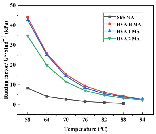Approximately 1.0 g of the asphalt binder was uniformly loaded between 25 mm diameter parallel plates with a 1 mm gap. Testing was performed at a fixed angular frequency of 10 rad/s. The test commenced at a starting temperature of 58 °C, with measurements of the complex shear modulus (G*), phase angle (δ), and rutting factor (G*/sin δ) recorded at 6 °C intervals. Three replicate specimens were tested for each condition. The high-temperature grade was determined according to the criterion requiring a rutting factor (G*/sinδ) of the original asphalt to be ≥1.0 kPa and that of the RTFOT residue to be ≥2.2 kPa [25].