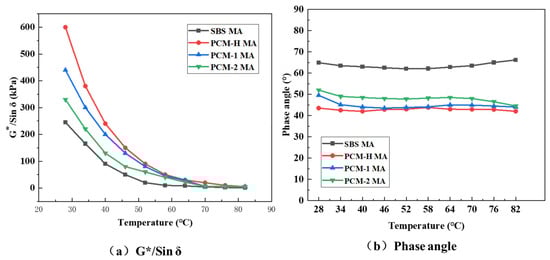 As shown in Figure 8a, at temperature below 64 °C, the complex shear modulus of both SBS MA and the polyolefin composite modified asphalts decrease rapidly with increasing temperature, indicating a transition from a viscoelastic solid to a viscous fluid state. When the temperature exceeds 64 °C, the phase angle remains below 90 °C with an insignificant increase, suggesting that these asphalts still exhibit properties of viscous fluids at high temperatures while maintaining excellent elastic recovery performance. With further temperature increase, the G*/sin δ of PCM-2 MA and PCM-1 MA converges with that of SBS MA, whereas the value for PCM-H MA remains significantly higher than all other samples. Notably, the modulus–temperature sweep curve for PCM-H MA exhibits a phenomenon where the modulus remains constant with increasing temperature. Generally, the phase angle increases with the rising temperature, indicating enhanced plastic behavior. However, except for SBS MA, the phase angles of the polyolefin composite modified asphalts decrease rather than increase at high temperatures. Among them, PCM-H MA and PCM-1 MA exhibit a more pronounced decrease in phase angle, while PCM-2 MA shows a relatively stable phase angle. This indicates that the polyolefin composite modified asphalts maintain a favorable balance of elasticity and viscosity at high temperatures. This rheological characteristic is a key factor in the superior and balanced high- and low-temperature performance of PCM-H MA. These temperature sweep test results align with the conventional performance analysis of the modified asphalts mentioned earlier.
