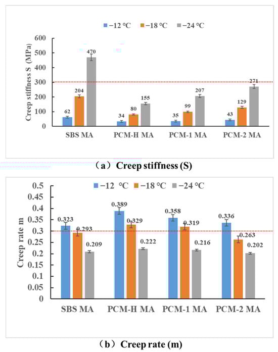 Research from the Strategic Highway Research Program (SHRP) has demonstrated that the low-temperature creep stiffness (S) and creep rate (m-value) derived from the Bending Beam Rheometer (BBR) test are closely correlated with the low-temperature fracture temperature of asphalt mixtures. The BBR test was used to evaluate the low-temperature crack resistance of different asphalt binders. Figure 9 presents the S-values and m-values for SBS MA and the polyolefin composite modified asphalts at test temperatures of −12 °C, −18 °C, and −24 °C.