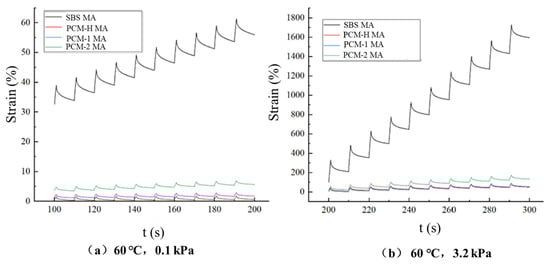 The cumulative creep strain of SBS MA and polyolefin composite modified asphalt with the change in load time. (a) 60 °C, 0.1 kPa; (b) 60 °C, 3.2 kPa.