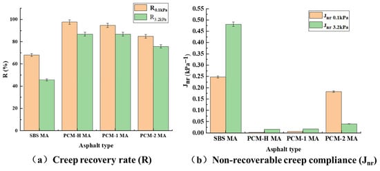 The MSCR test utilizes two parameters to evaluate the deformation resistance of asphalt: the recovery rate (R) and the non-recoverable creep compliance (Jnr), defined in Equations (2) and (3). The recovery rate (R) represents the asphalt’s elastic recovery following the removal of stress, thereby highlighting its elastic characteristics. In contrast, Jnr provides a more direct and performance-relevant measure of rutting resistance than the conventional rutting factor (G*/sin δ).