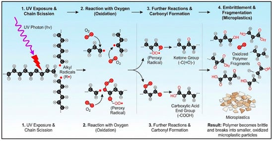 Schematic representation of UV-driven photo-oxidation and chain scission in a polymer leading to microplastic formation.