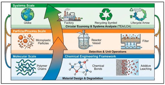 Microplastic pollution is a defining environmental crisis of the Anthropocene, threatening ecosystems and human health due to its persistence and global dispersion. This review synthesizes current knowledge through a chemical engineering framework, analyzing the contaminant’s lifecycle from formation and environmental fate to detection and removal. We systematically evaluate conventional and advanced mitigation technologies, highlighting the potential of engineered adsorbents (e.g., functionalized sponges, biochar) for targeted capture while underscoring the limitations of current wastewater treatment for nano-plastics. The analysis extends beyond end-of-pipe solutions to underscore the imperative for sustainable polymer design and circular economy systems, where biodegradable polymers and chemical recycling must be integrated. Crucially, we identify techno-economic analysis (TEA) and life-cycle assessment (LCA) as essential, yet underdeveloped, tools for quantifying the true cost and sustainability of management strategies. The synthesis concludes that addressing microplastic pollution requires the integrated application of chemical engineering principles across molecular, process, and system scales, and it identifies key research priorities in advanced material design, standardized analytics, hybrid treatment processes, and comprehensive impact modeling.