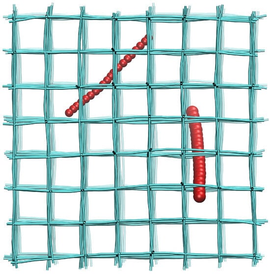 We employed coarse-grained molecular dynamics (CGMD) simulations to investigate the diffusion of nanorods in cross-linked networks. Both the network and nanorod were constructed using bead-spring CG model. The cross-linked network, built as a cubic lattice with a mesh size of (where is the length unit), consists of 9016 CG beads. The detailed methodology for constructing the network is described in our previous work [30]. Each nanorod was modeled as a linear chain of CG beads, with the numbers of CG beads N set to 10, 15, 20 and 25, to represent the various lengths of nanorods. The methodology for building nanorods with different flexibility has been adopted in some previous work [24,31]. A schematic diagram of our simulation system is shown in Figure 1.