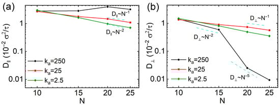 Diffusion coefficients parallels to (a) and perpendicular to (b) the major axes of thin nanorods with different rigidities as a function of N values.