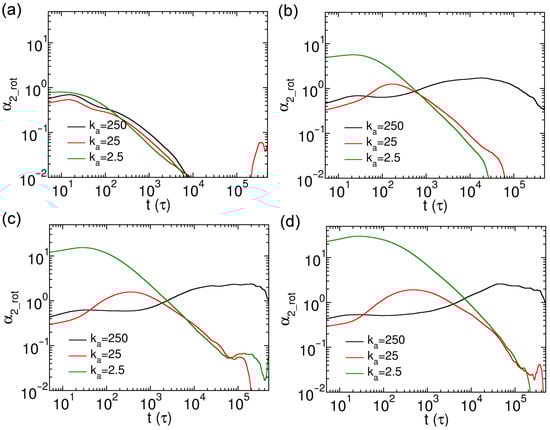 Rotational non-Gaussian parameters for thin nanorods with different N and rigidities. Results are shown for nanorods composed of (a) 10, (b) 15, (c) 20, and (d) 25 CG beads, respectively.