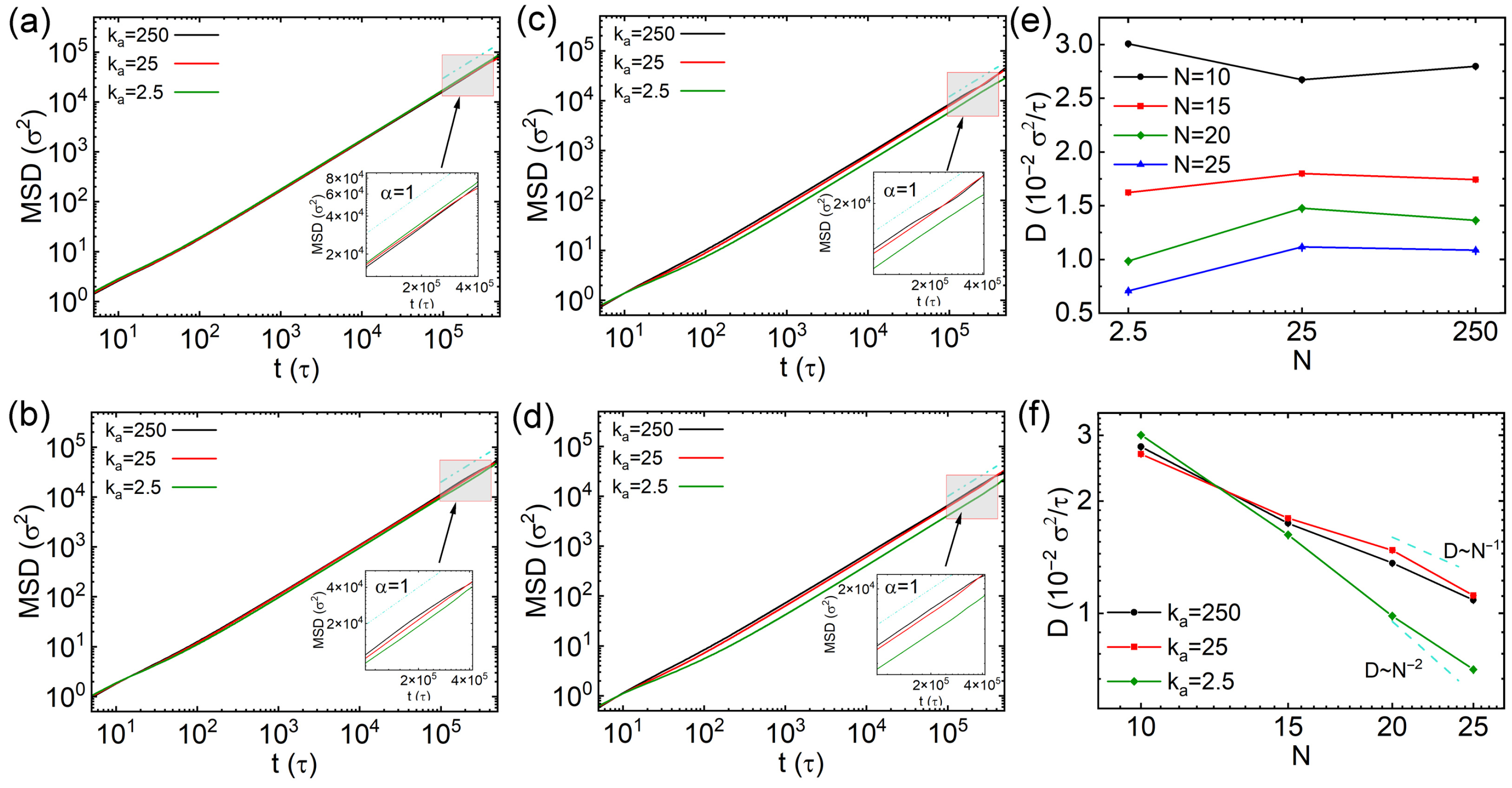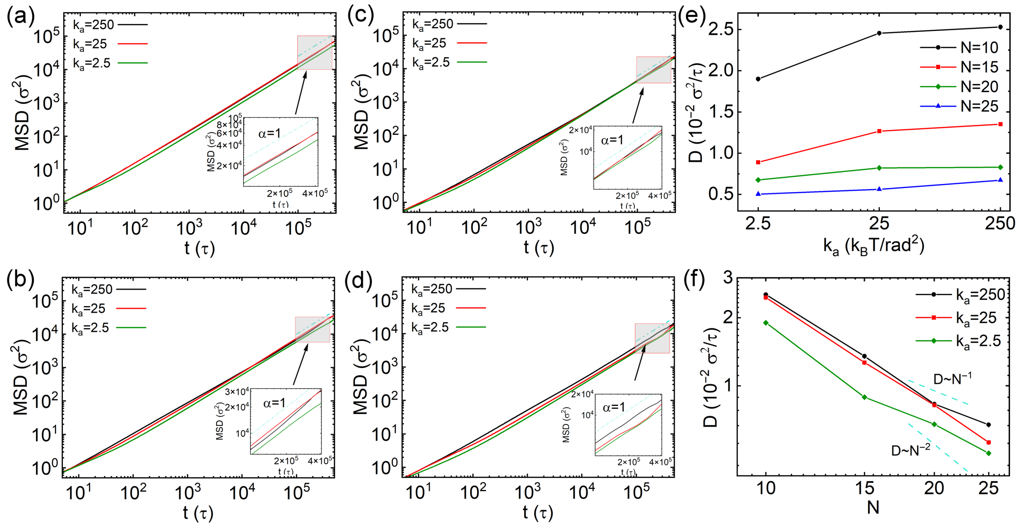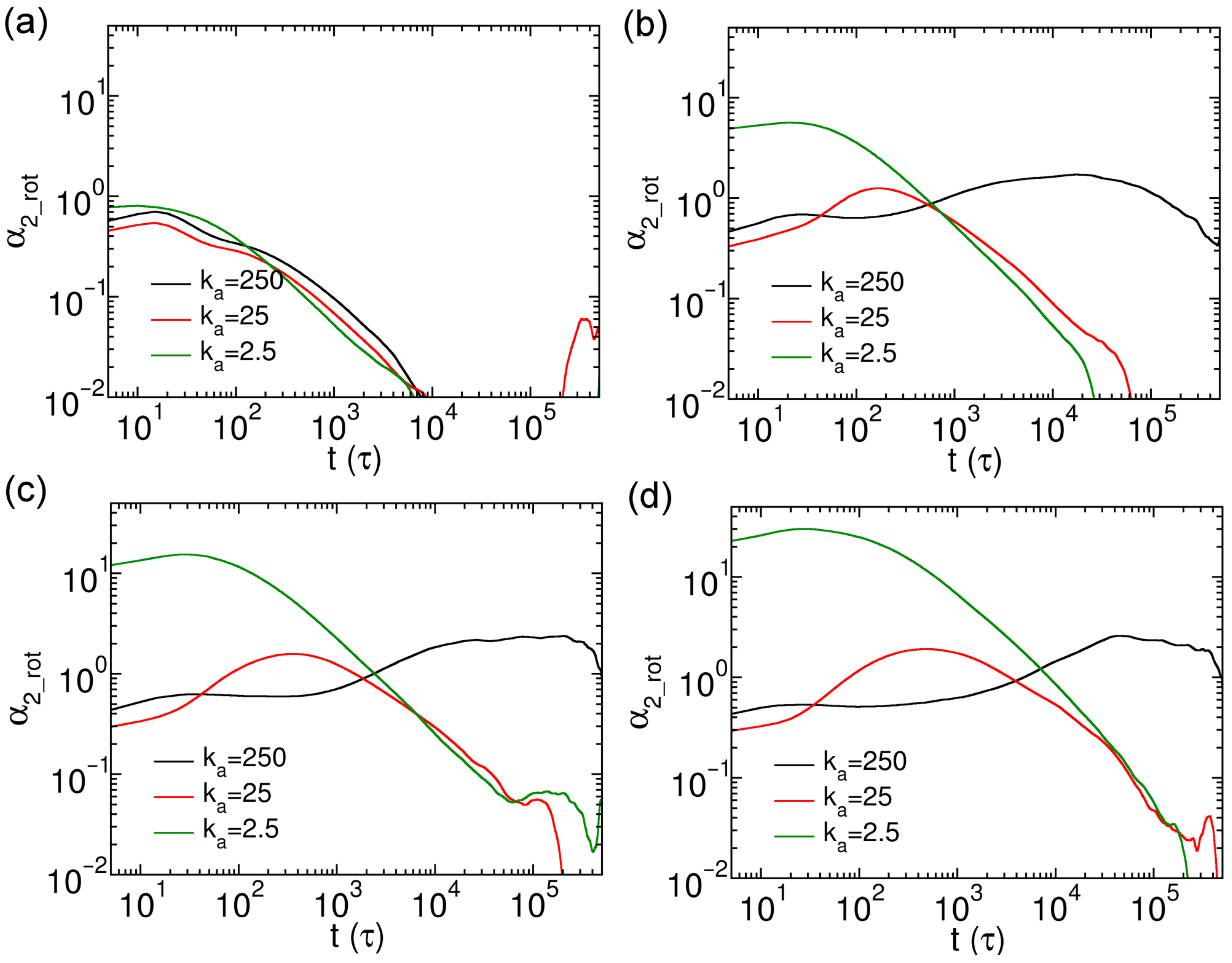 Figure 9b–d). The anomalous diffusion behaviors of these longer thick nanorods are similar to those of thin nanorods, except that sub-diffusion emerges at earlier simulation times (