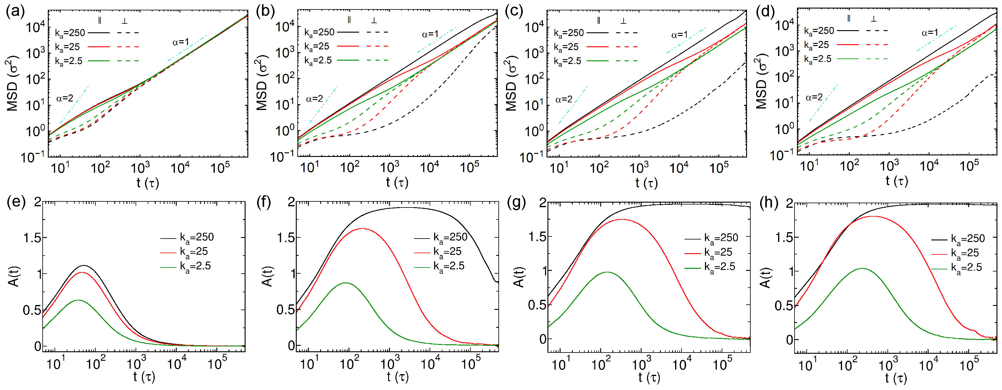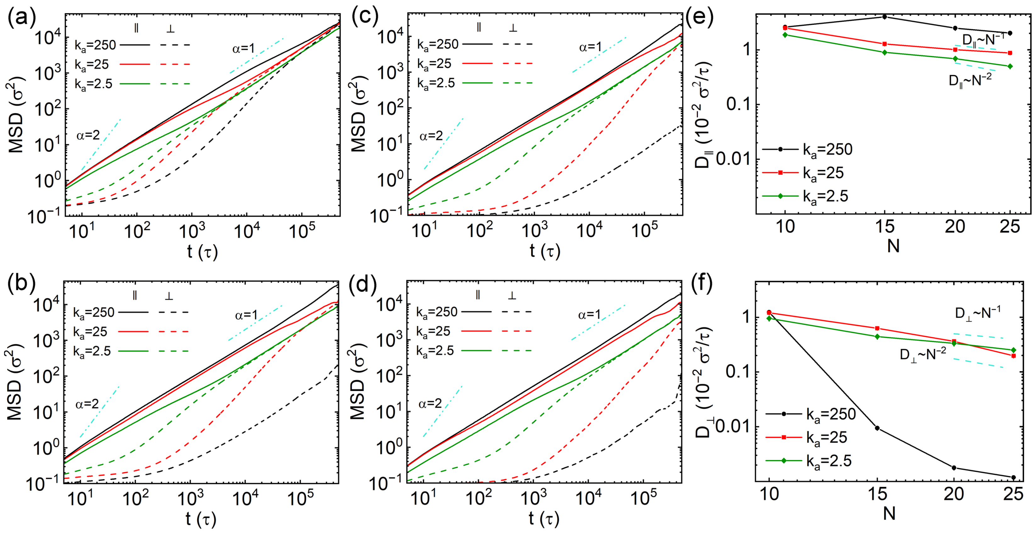 also exhibit super-diffusion effect following initial ballistic diffusion. In contrast, the perpendicular MSDs display more noticeable sub-diffusion between