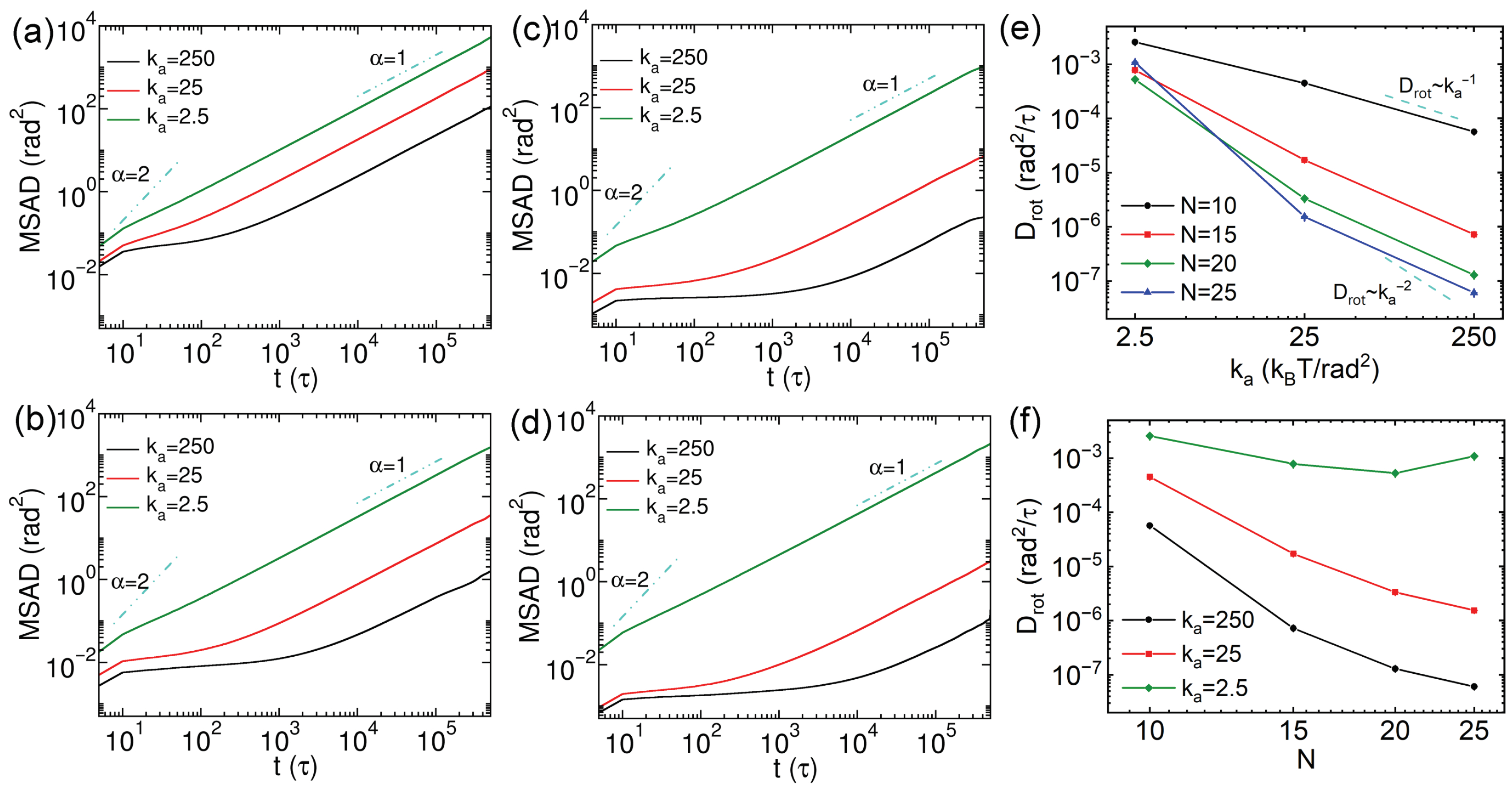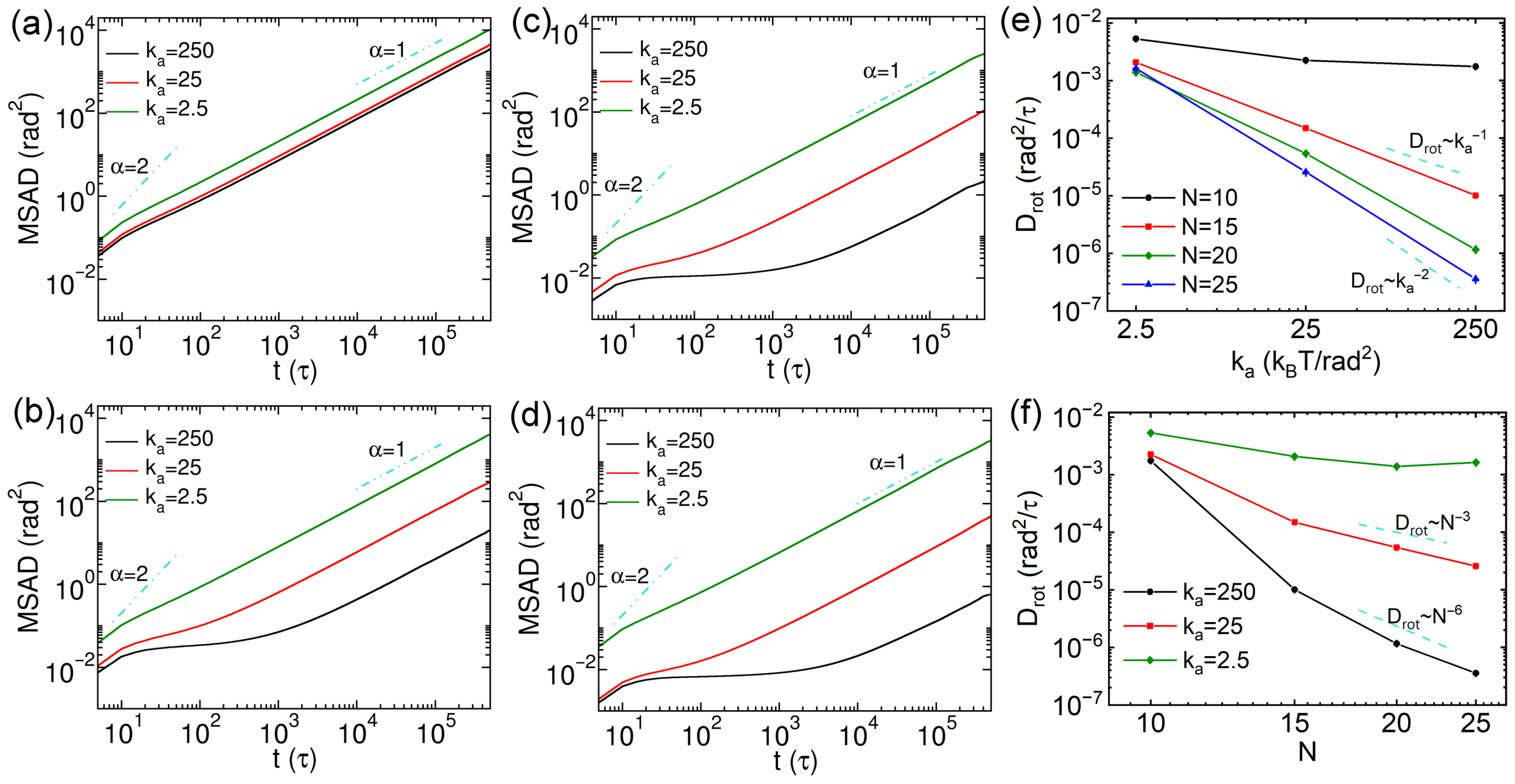 The rotational dynamics of thick nanorods were also characterized via calculating MSADs, and their rotational diffusion coefficients (
