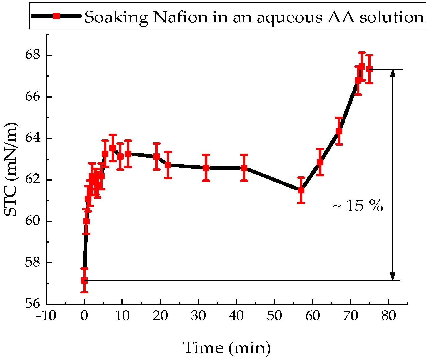 12], the wetting angle from a drop of water applied to the surface of the Nafion was measured as it was soaked in water. An abrupt decrease in the wetting angle was found, which indicates the transition of the membrane from a hydrophobic to a hydrophilic state.