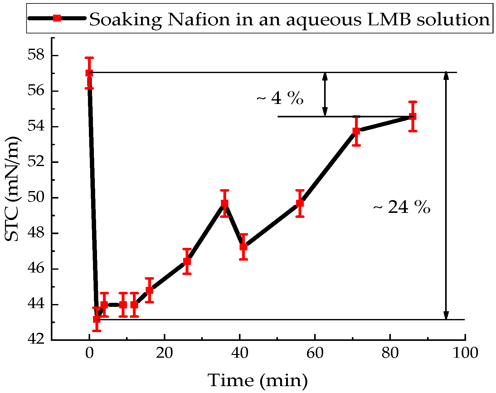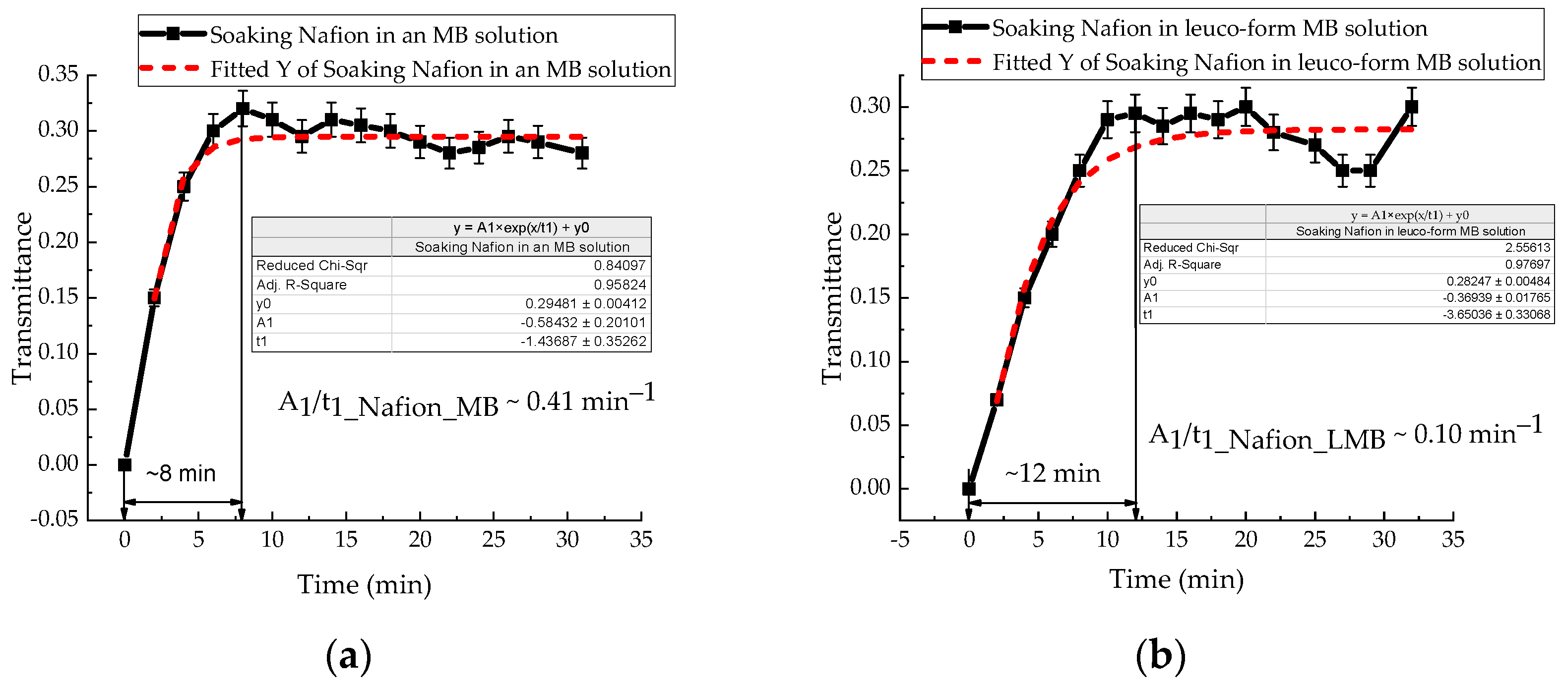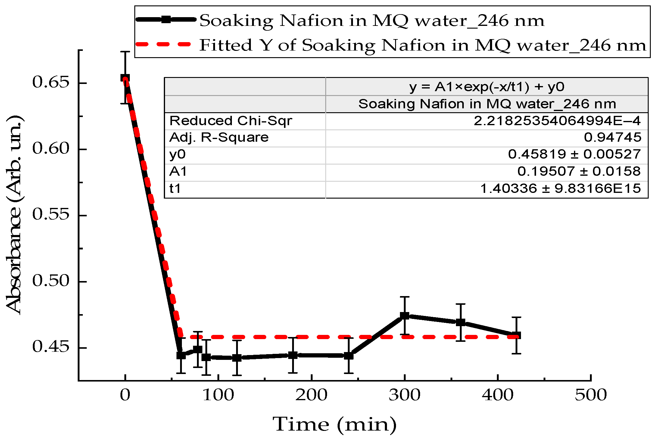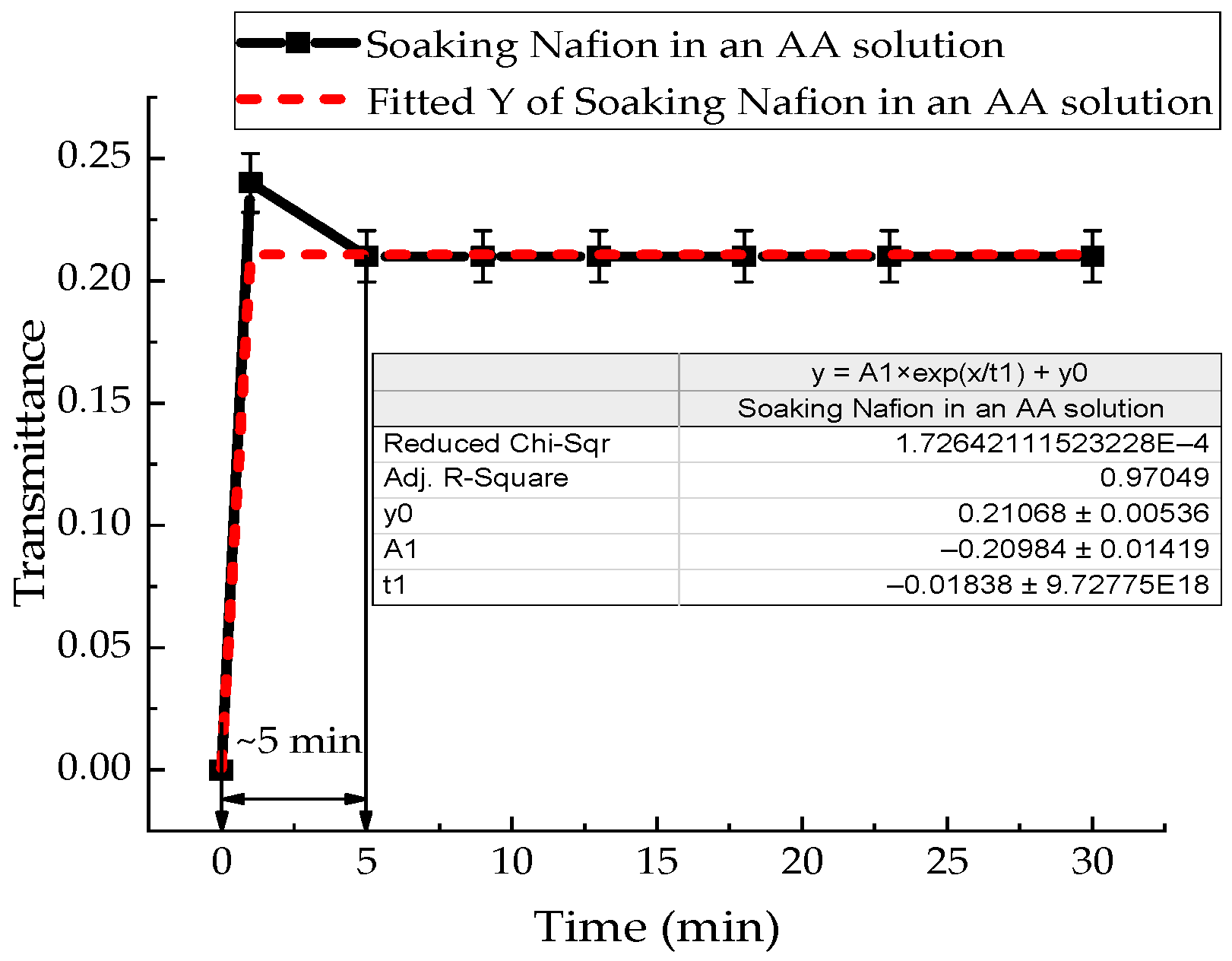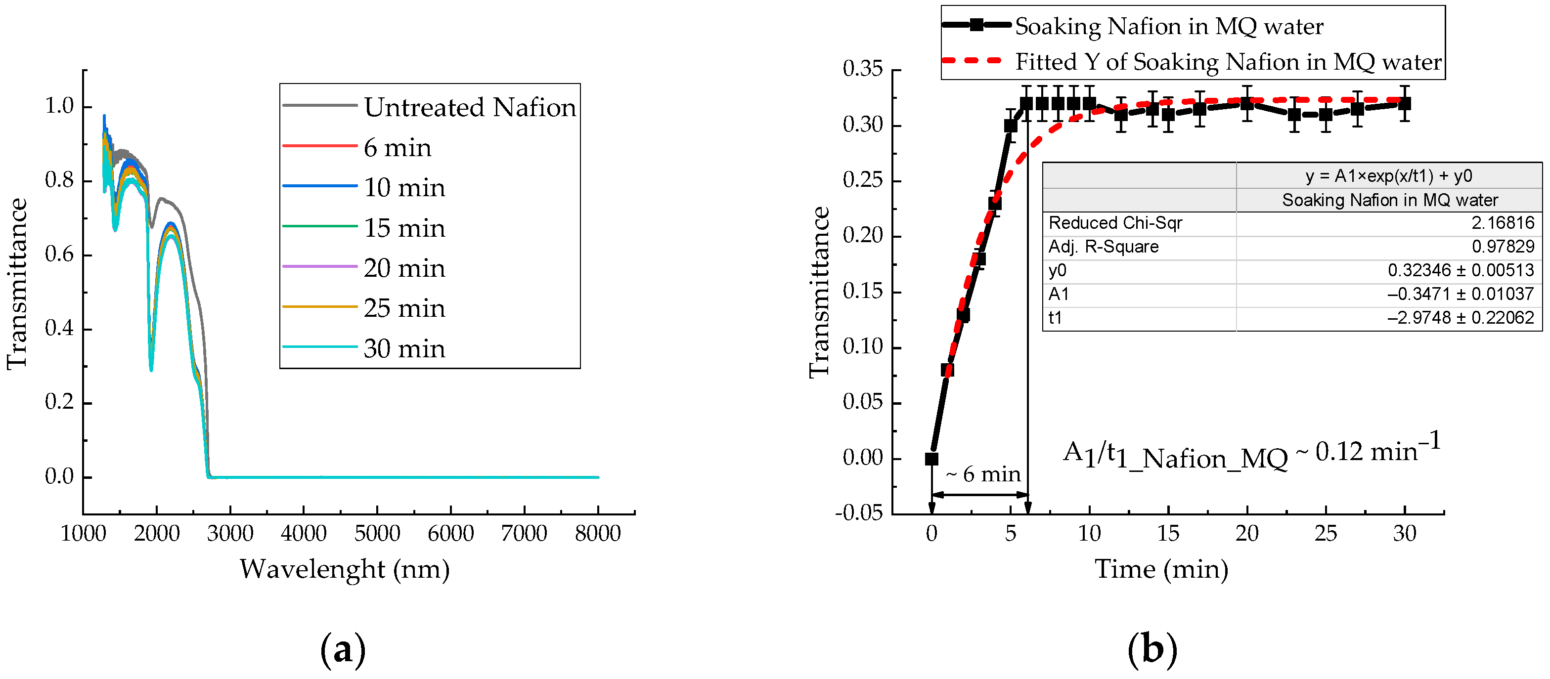 −1. Based on the results of absorption spectrophotometry experiments, when the Nafion membrane is soaked in distilled water (157 ppm), the swelling time of the membrane is approximately (60–70) minutes (