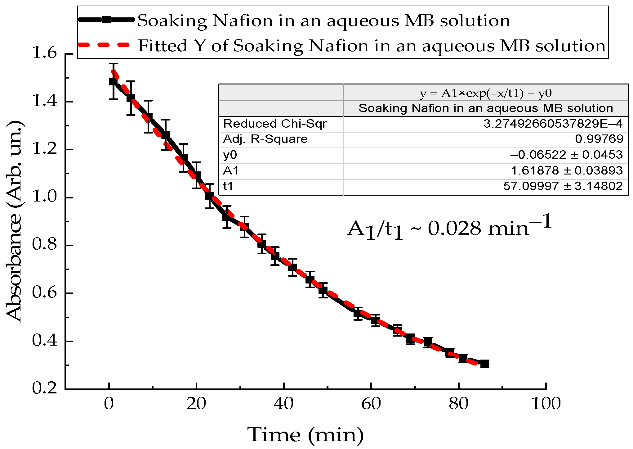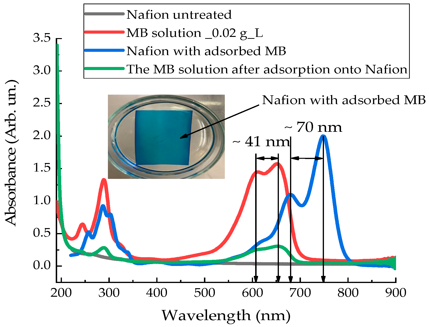 36], the Nafion matrix was considered as a model medium for further studying the interaction of drugs with a living cell in the treatment of viral diseases. The rate of adsorption of MB on the surface of the Nafion polymer membrane was studied in near-UV and visible-light spectrophotometry experiments [