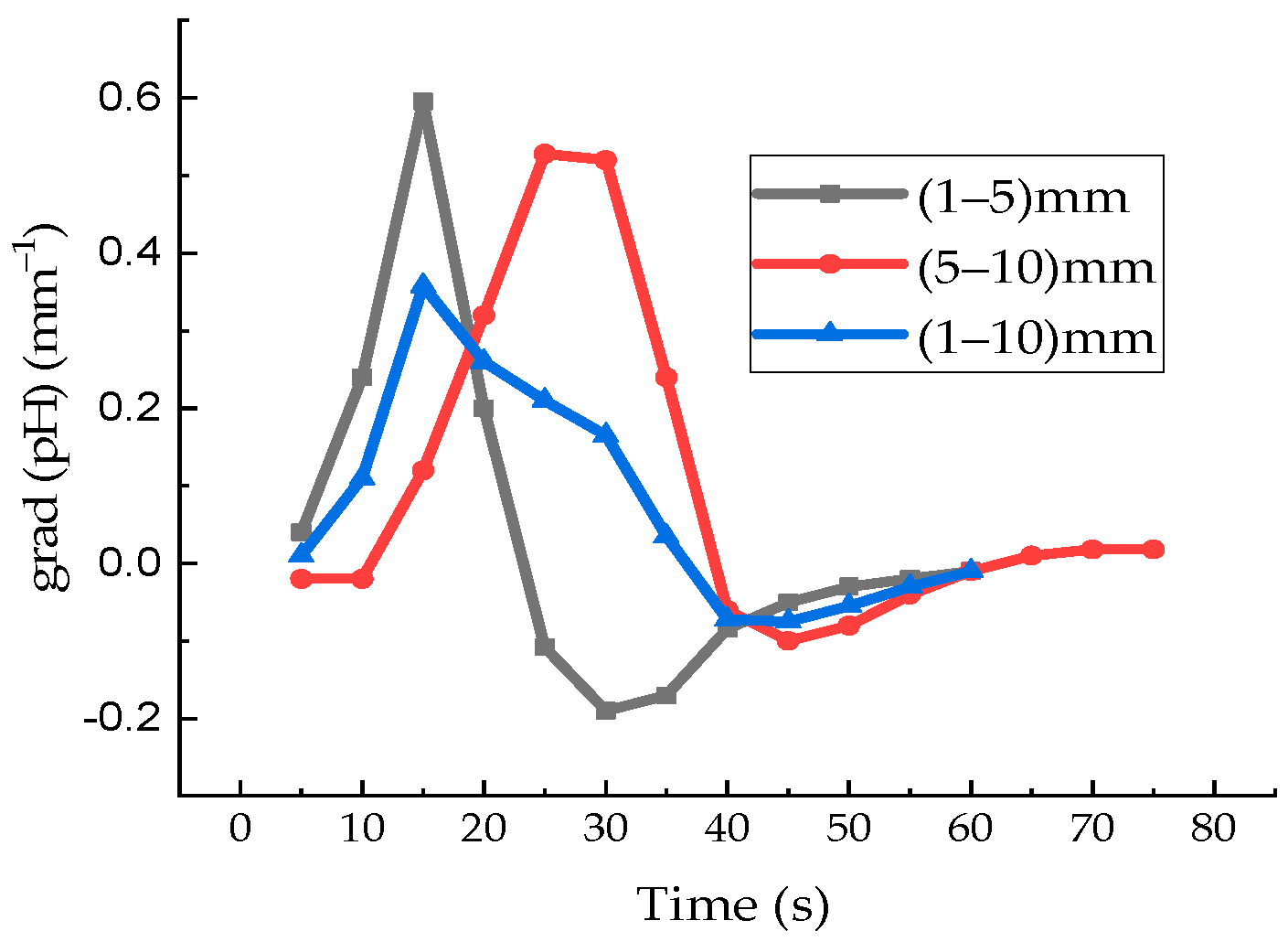 Figure 5). Therefore, it can be assumed that the flows in the near-surface region into the volume of the solution will be about 7 times greater than into the volume of the membrane. The intensity of the liquid flows near the membrane surface decreases as the membrane swells. The creation of additional forces in the volume of liquid near the membrane and in the volume of the membrane is relevant for systems containing ion-exchange membranes, during the adsorption and desorption of solutions required for the extraction of components, during the transportation of medicinal components of solutions in biological systems.