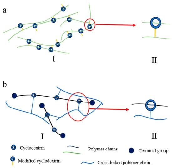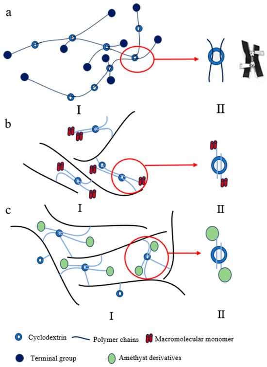 Two primary synthetic pathways have been developed for constructing these networks. The first approach involves pre-modifying CDs with vinyl or other polymerizable functional groups, followed by direct formation of the sliding cross-linked network through free radical copolymerization with comonomers such as acrylates or isoprene [46,56,57,58] (Figure 2(aII)). The alternative strategy begins with the preparation of PRs, followed by chemical modification of the threaded CDs through hydroxypropylation [59], carboxymethylation [60], or maleic anhydride functionalization [37], ultimately leading to cross-linking reactions with complementary monomers (Figure 2(bII)).