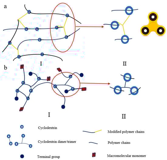 Fidget spinner-shaped cross-linked networks and corresponding cross-linking points prepared by (a) azidated CD mixed with PEG forms a cross-linked network; (b) CD dimers or trimers mixed with PEG form a cross-linked network.