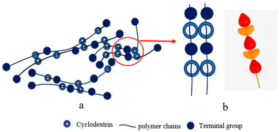 Since de Gennes proposed the “sliding gel” concept in 1999, highlighting its potential for tension equalization [20], subsequent research has sought suitable molecular architectures to realize this theoretical framework. Cyclodextrin (CD) have attracted significant research interest as key building blocks for such systems, owing to their unique amphiphilic cavity structure [21,22,23]. The characteristic “hydrophilic exterior-hydrophobic interior” architecture enables stable pseudorotaxane formation with appropriate polymer chains [24,25]. Furthermore, the abundant surface hydroxyl groups permit diverse chemical modifications, facilitating various sliding cross-link configurations that expand structural diversity and enable multifunctionalization [26,27,28,29]. These attributes establish CDs as ideal constituents for constructing SRPs. Recent advances have demonstrated substantial progress in fabricating CD-based SRPs through precise control of CD functionalization [30,31], polymer backbone selection, and CD variety [32,33], yielding diverse sliding cross-linked networks, also referred to as topological cross-linked networks. This rational molecular design enables precise control over key performance metrics, such as fracture energy, Young’s modulus, and hysteretic dissipation. By establishing a direct bridge from sliding cross-linkers to bulk mechanics, it unlocks the potential for applications that demand exceptional mechanical performance.