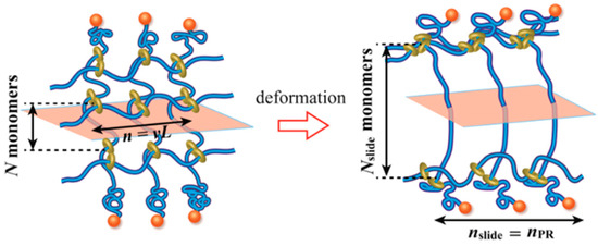 - Koga, T.; Tanaka, F. Elastic properties of polymer networks with sliding junctions. Eur. Phys. J. E 2005, 17, 225–229. [Google Scholar] [CrossRef] [PubMed]