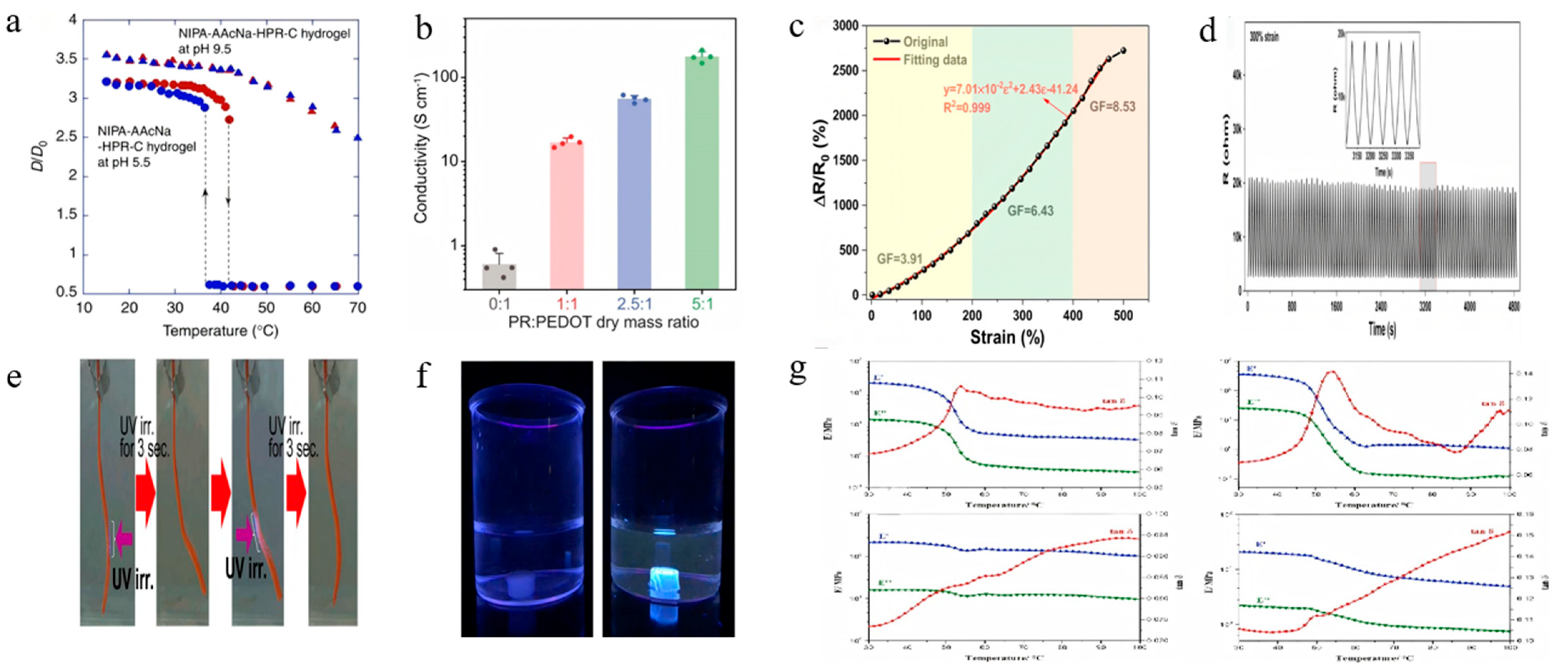 | Electrical function | choline chloride (ChCl) [19], functionalized CD [83] | PR content affects conductivity [83] (Figure 10b), excellent ionic conductivity (0.93 S/m) [19], sensitive resistance response to strain (Figure 10c), stable signal output [19] (Figure 10d). |