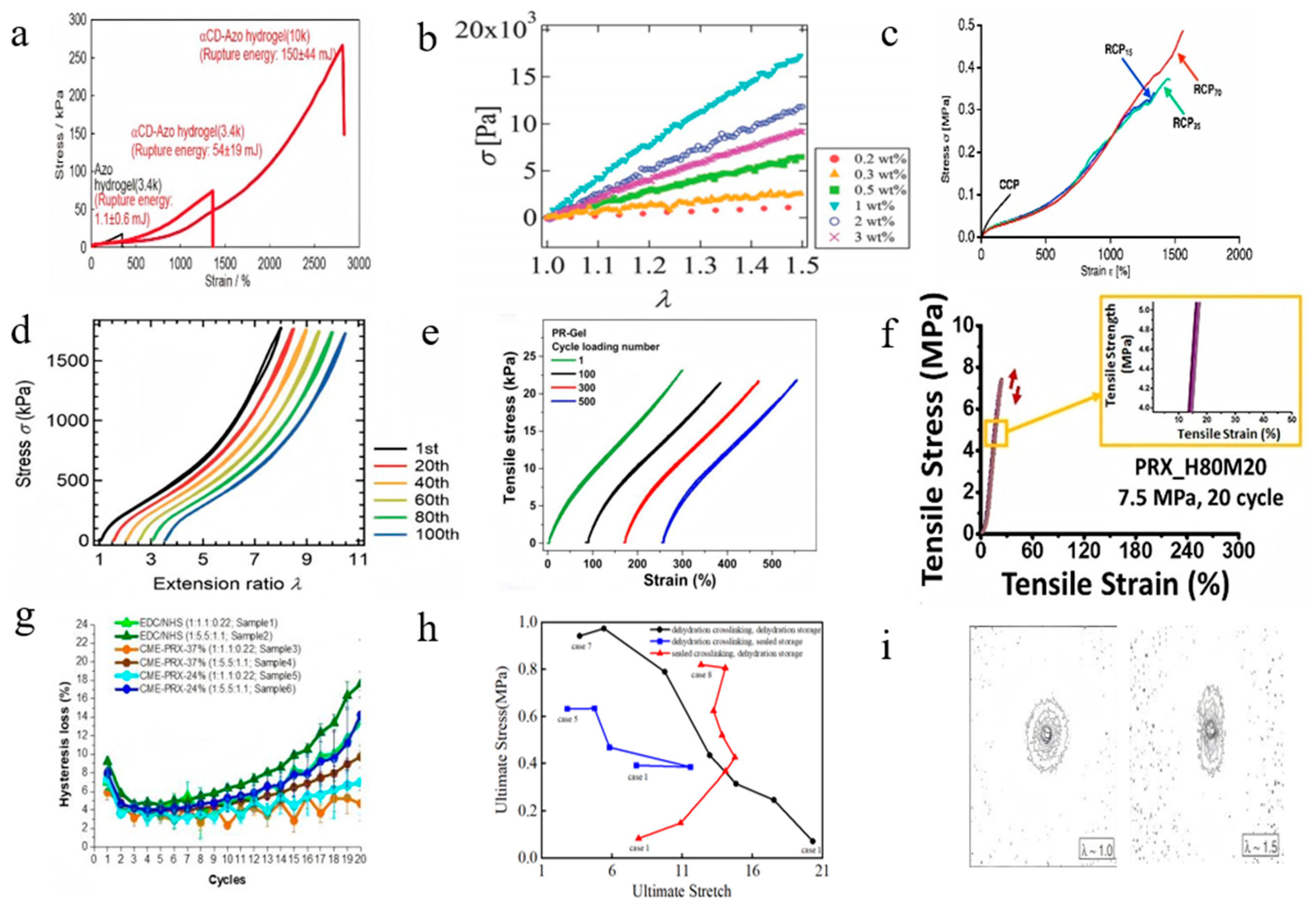 | Tensile strength | 40.9 kPa (SRPs with cross-linking agent concentration of 2 wt%) [59], 78.1 kPa (SR gel with AM concentration of 40 w/v%) [19], 130 kPa (SR gel with molecular weight of 100 kDa of PEG) [70], 270 kPa (αCD-Azo hydrogel) [17], 444 kPa (SR gel with coverage rate of 4.4%) [97], 490 kPa (RCPs with DPn value of 70 for PTHF parts) [65], 674 kPa (SRPs with cross-linking agent of 1 w%) [56], 974 kPa (SR gel with water content of 18.36%) [49], 5.5 MPa (SR gel with PEG volume fraction of 38%) [18], 8.7 MPa (SRPs mixed with HDI and MDI in an 80:20 ratio) [94], 27 MPa (RCPs with TBM-2 cross-linking agent) [66]. |