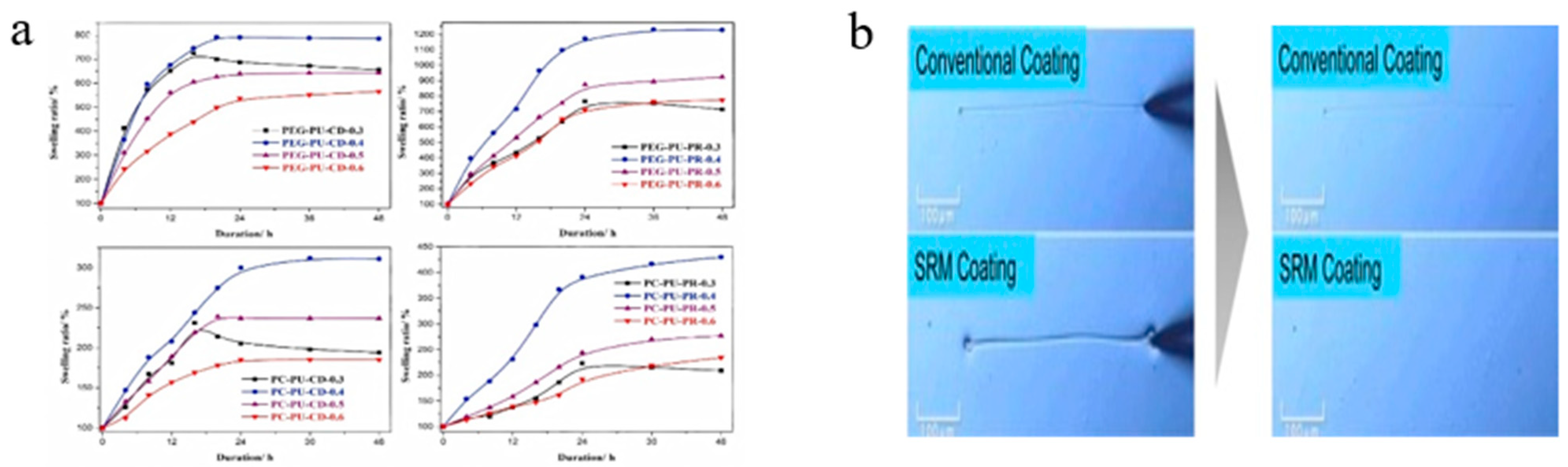 | Elongation at break | 200% (SRPs mixed with HDI and MDI in an 80:20 ratio) [94], 450% (RCPs with TBM-2 cross-linking agent) [66], 800% (PNIPA gel) [93], 830% (SR gel with AM concentration of 40 w/v%) [19], 991% (SR gel with coverage rate of 4.4%) [97], 1200% (SR gel with molecular weight of 35 kDa of PEG) [70], 1480% (SRPs with ion cross-linking agent concentration of 0.8 wt%) [59], 1530% (SR gels with PEG volume fraction of 18%) [18], 1560% (RCPs with degree of polymerization (DPn) value of 70 for PTHF parts) [65], 1650% (SRPs with cross-linking agent concentration of 5 w%) [56], 2030% (SR gel with water content of 40.63%) [49], 2800% (αCD-Azo hydrogel) [17]. |