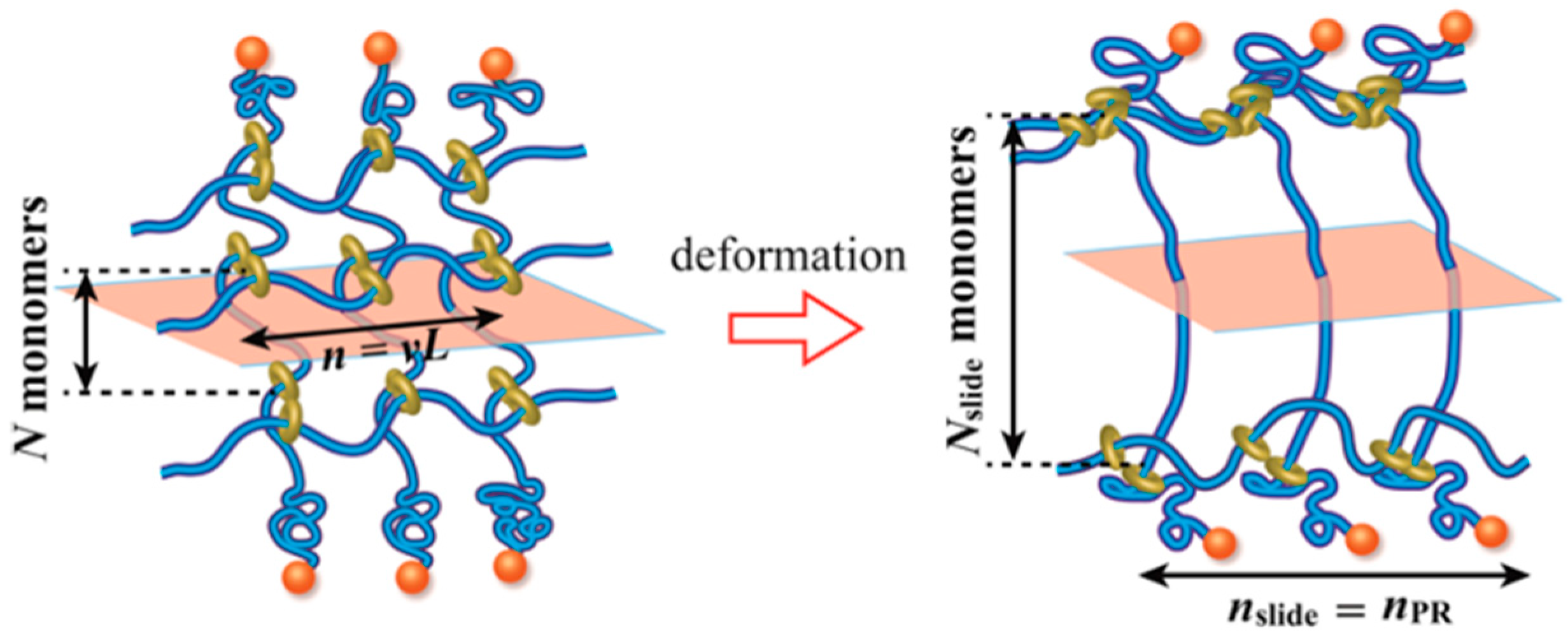 - Chen, D.; Panyukov, S.; Sapir, L.; Rubinstein, M. Elasticity of slide-ring gels. ACS Macro Lett. 2023, 12, 362–368. [Google Scholar] [CrossRef] [PubMed]
