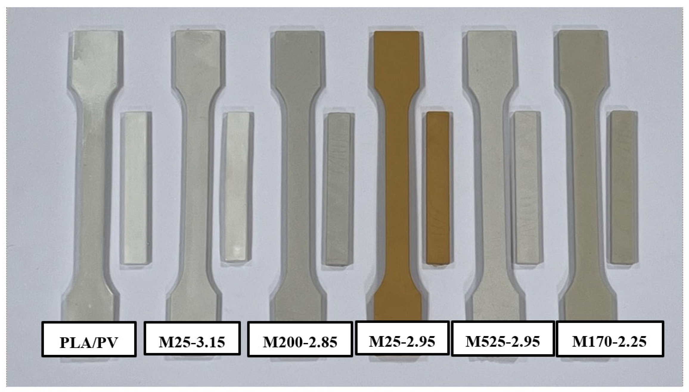 - Vengadesan, E.; Morakul, S.; Muralidharan, S.; Pullela, P.K.; Alarifi, A.; Arunkumar, T. Enhancement of Polylactic Acid (PLA) with Hybrid Biomass-Derived Rice Husk and Biocarbon Fillers: A Comprehensive Experimental Study. Discov. Appl. Sci. 2025, 7, 161. [Google Scholar] [CrossRef]