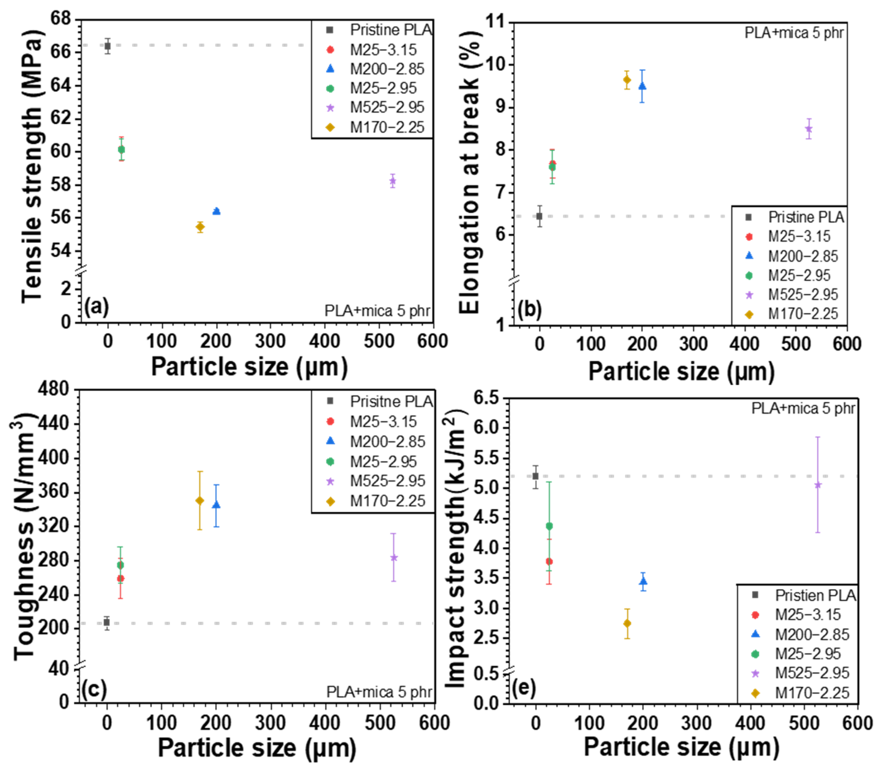 | This study: PLA/mica (5 phr) | 46–53 | - | 4–11 | 2–3 | 52–56 |