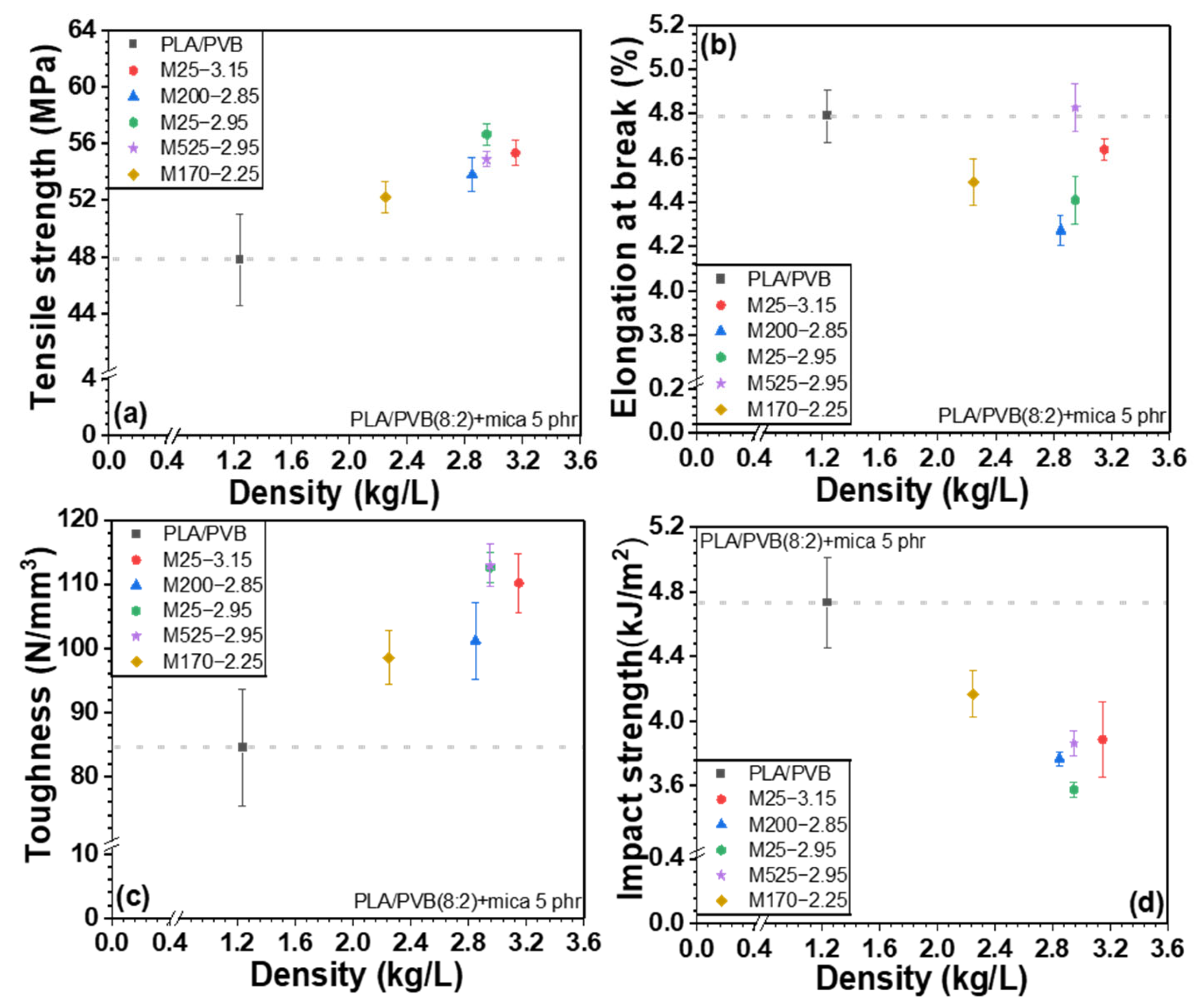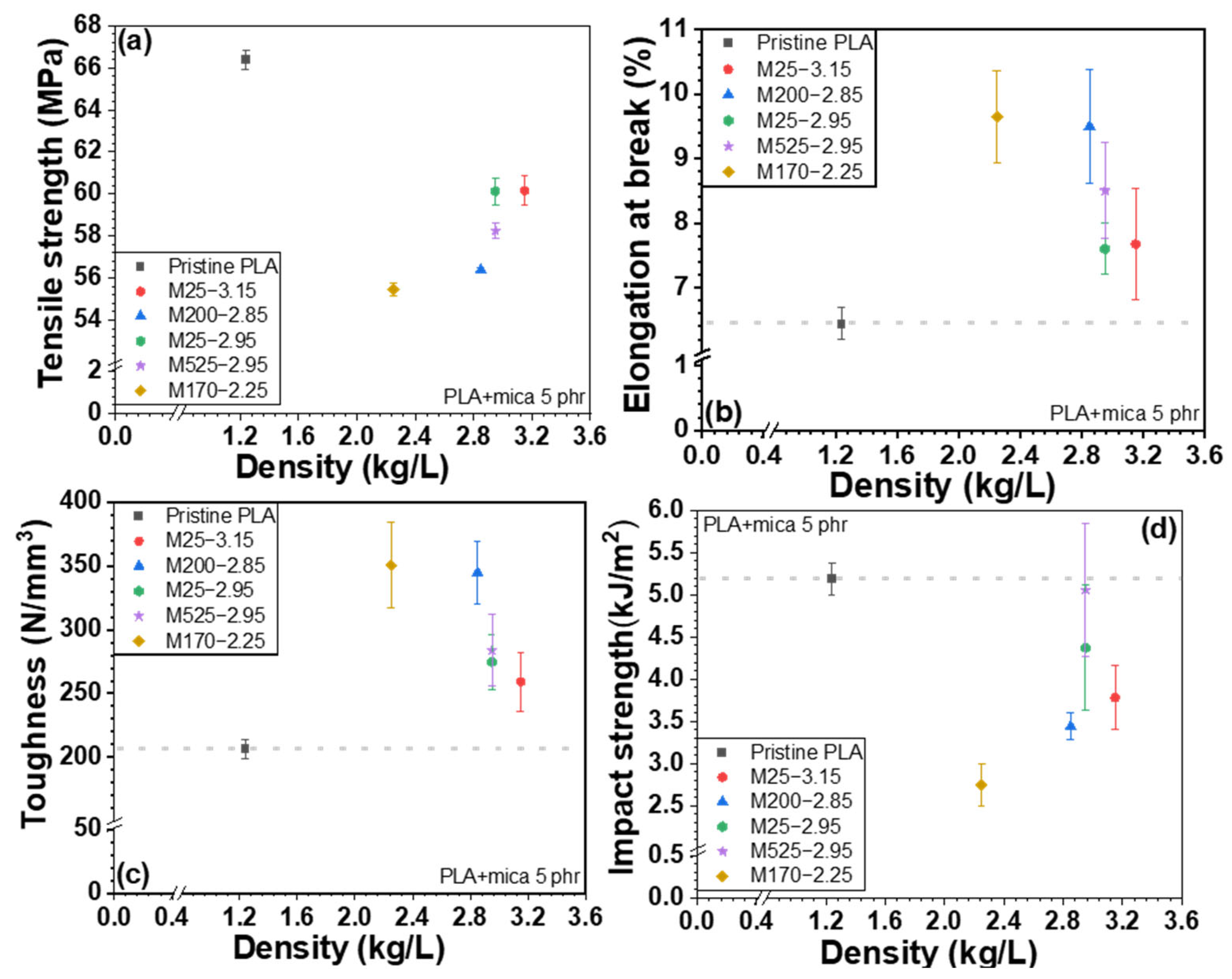| PLA + Mica (single grade) | 52–59 | 3.5–5.0 | 4–9 | 3–5 | 53–58 |