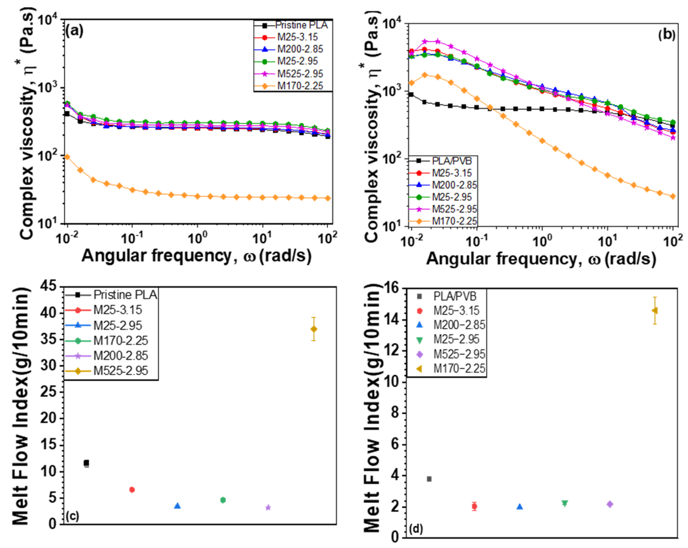 - Souza, D.H.S.; Andrade, C.T.; Dias, M.L. Rheological Behavior of Poly(Lactic Acid)/Synthetic Mica Nanocomposites. Mater. Sci. Eng. C 2013, 33, 1795–1799. [Google Scholar] [CrossRef] [PubMed]