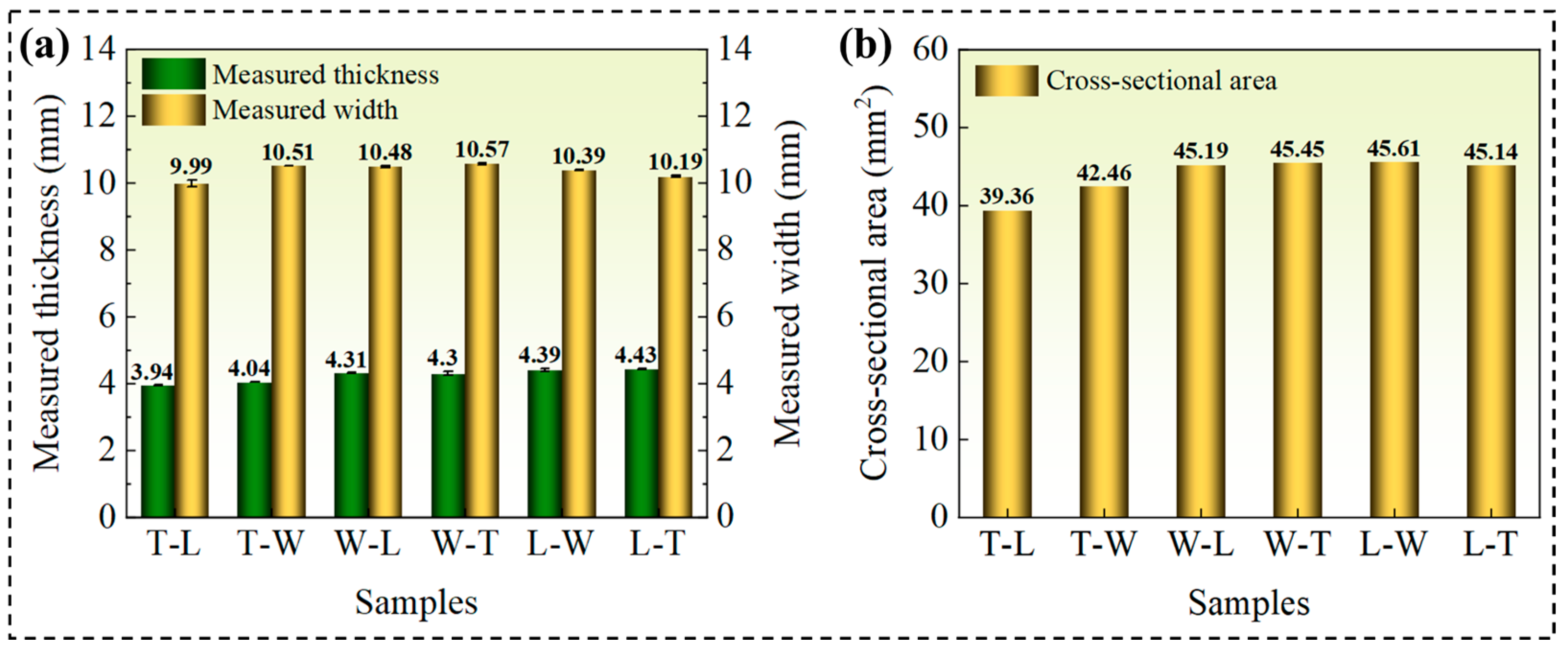 | Sample Name | Measured Width Wm (mm) | Measured Thickness Tm (mm) | Cross-Sectional Area Am (mm2) | ||||||||||