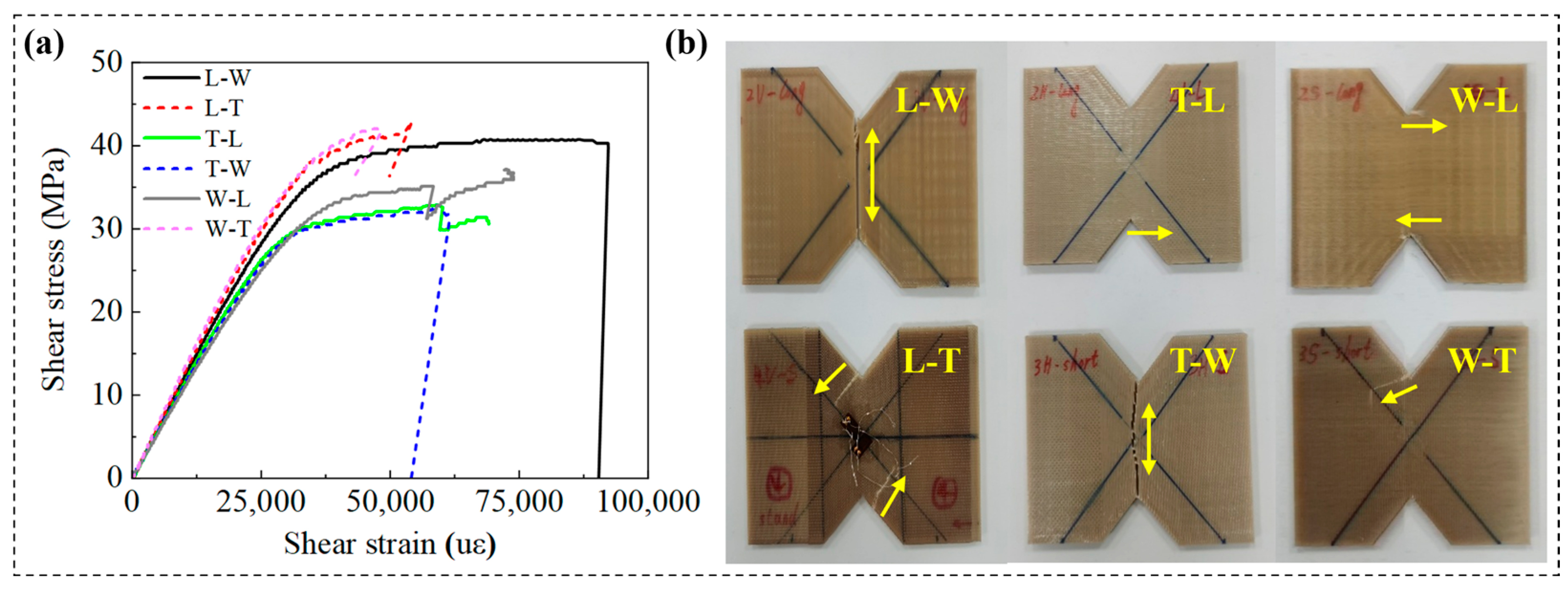- ASTM D7078; Standard Test Method for Shear Properties of Composite Materials by V-Notched Rail Shear Method. ASTM International: West Conshohocken, PA, USA, 2020.