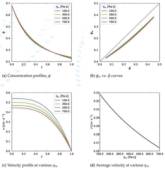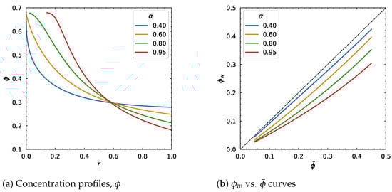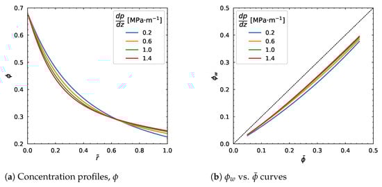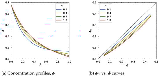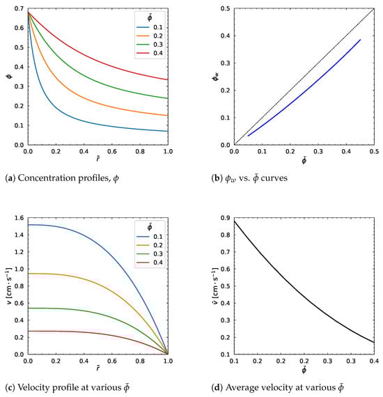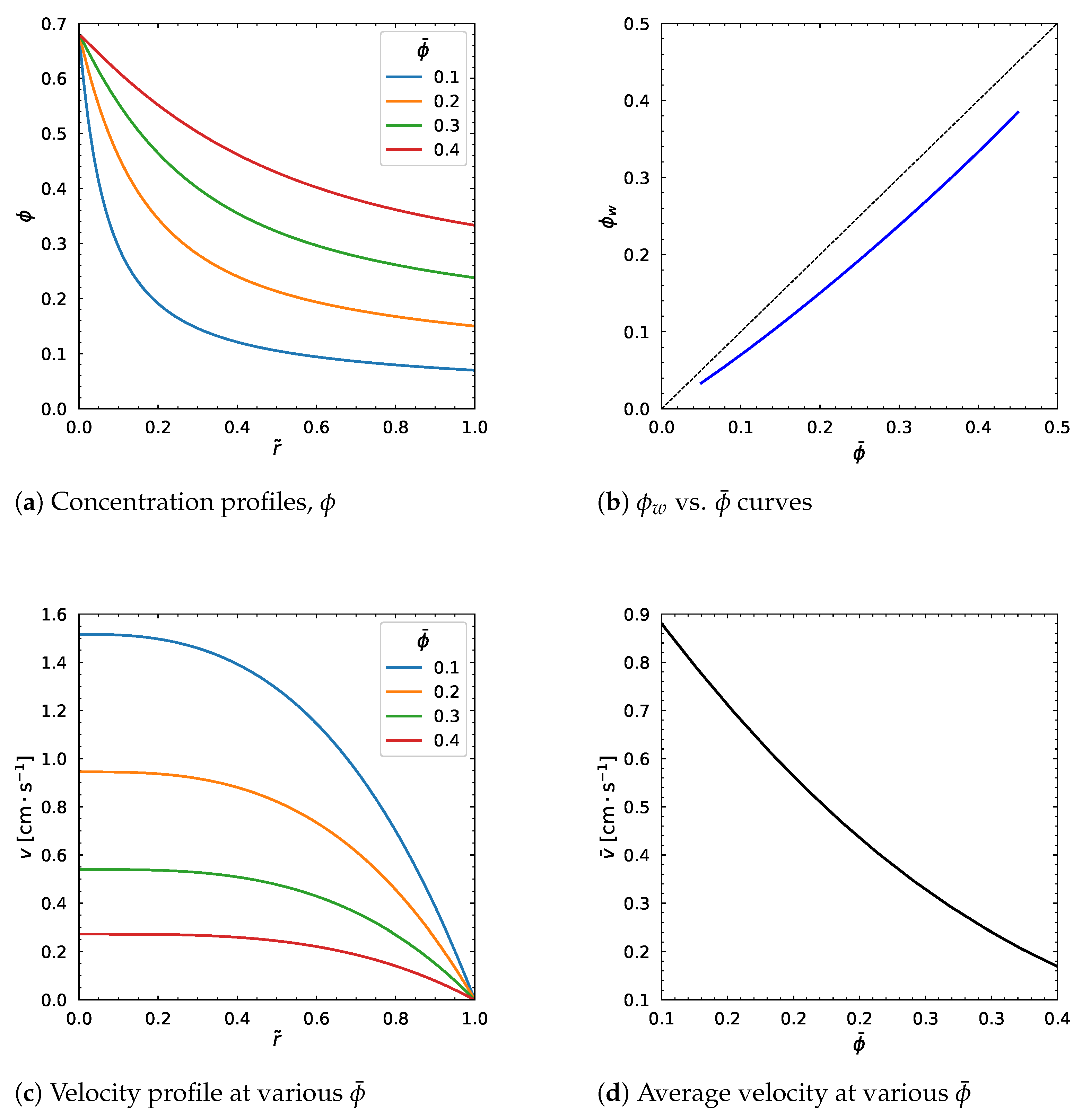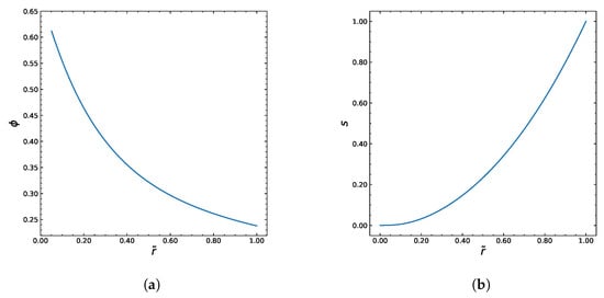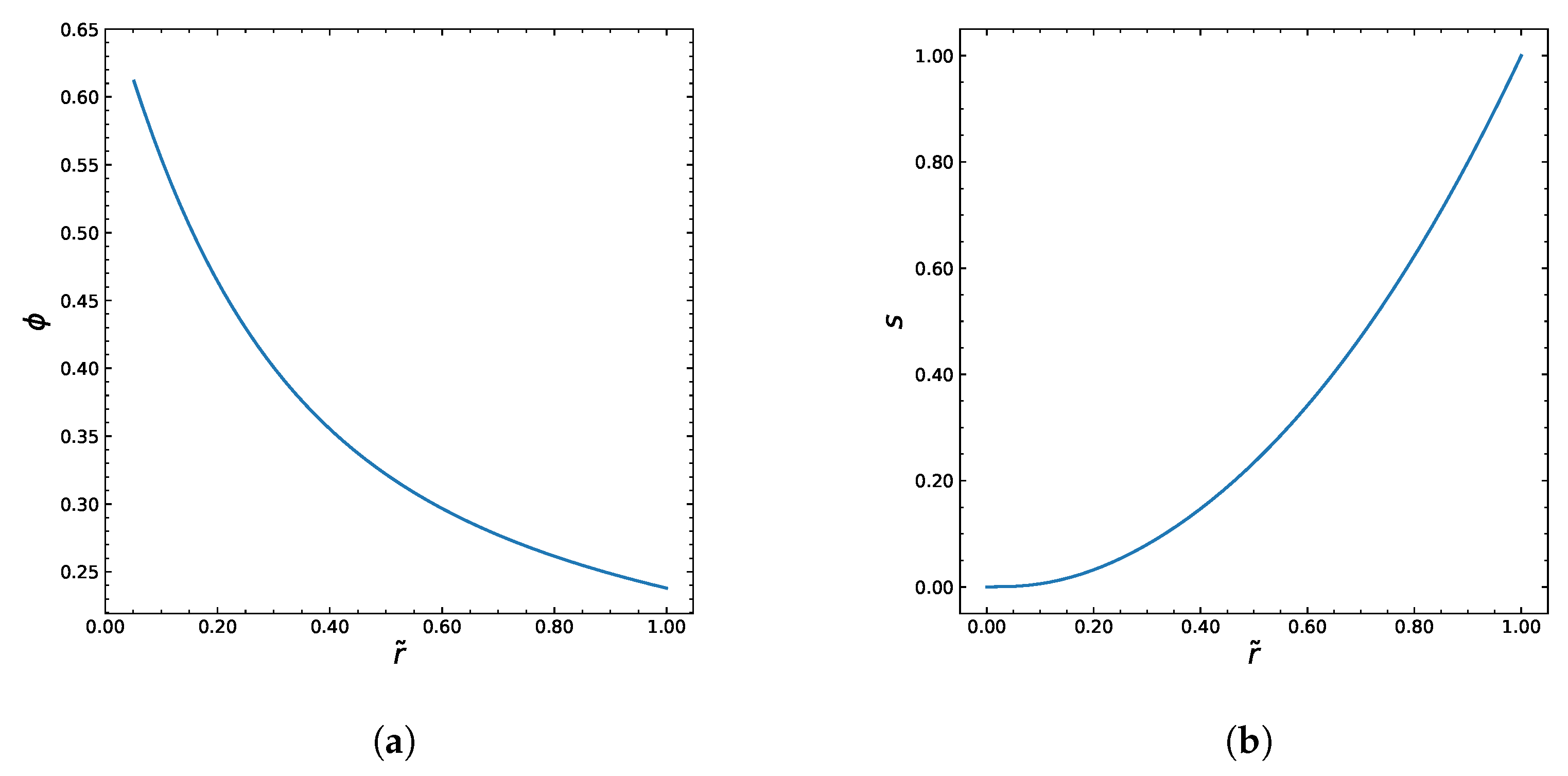 Figure 3. Numerical solutions for microstructural fields obtained from the Carreau–Yasuda-based model. (a) Distribution of particle volume fraction  ϕ ( r ˜ )  along the axis of dimensionless radius  r ˜ . (b) Graph of the non-dimensional variable  s ( r ˜ )  v.s. dimensionless radius  r ˜ .