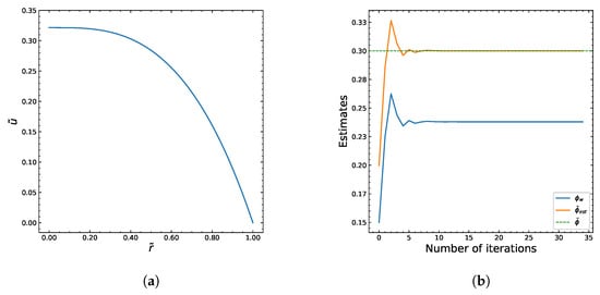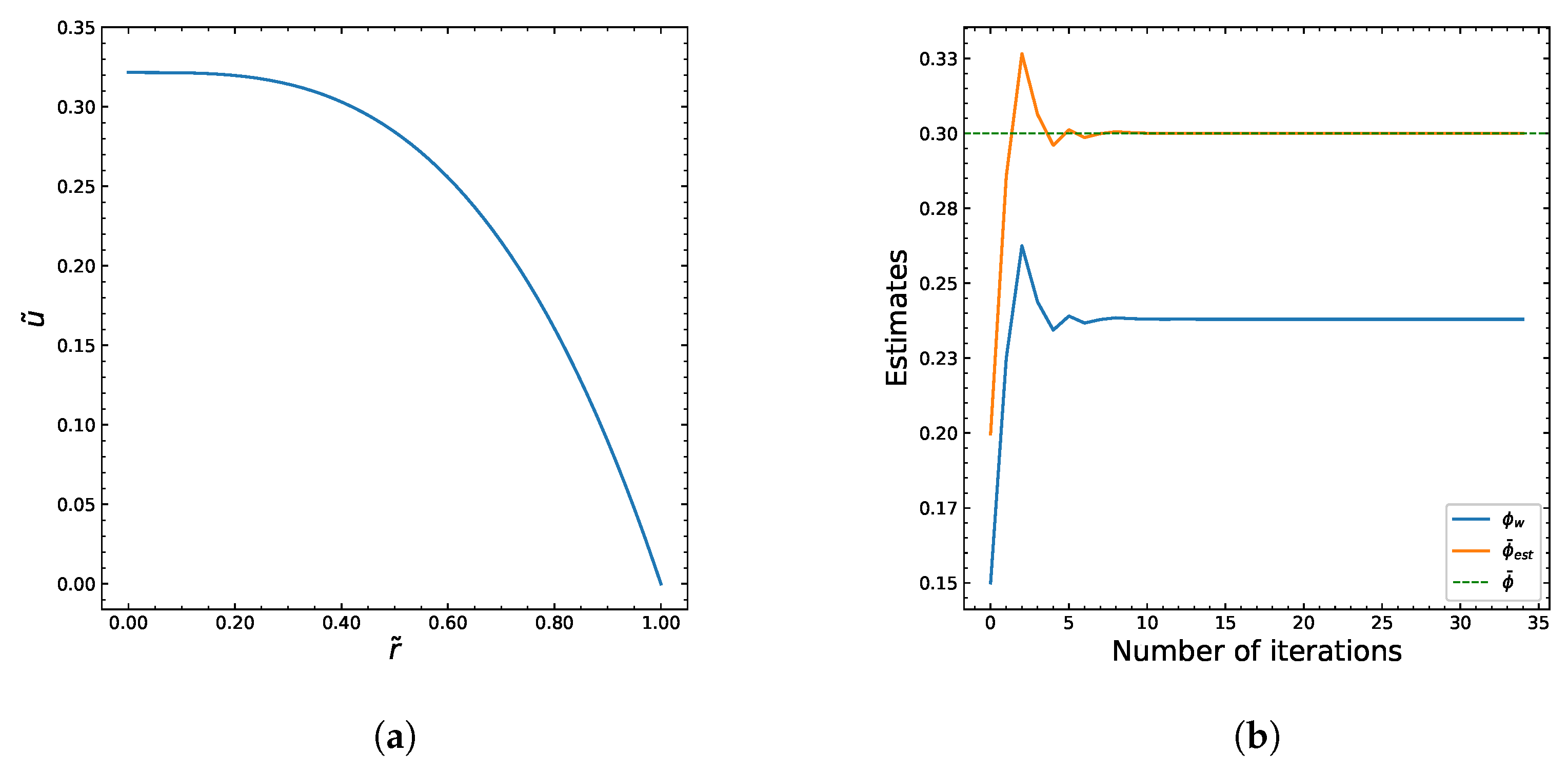 Figure 4. Macroscopic flow characteristics obtained from the numerical algorithm. (a) Dimensionless velocity profile  u ˜ ( r ˜ )  across the tube radius. (b) Convergence history of the iterative scheme for determining the wall particle fraction  ϕ w .