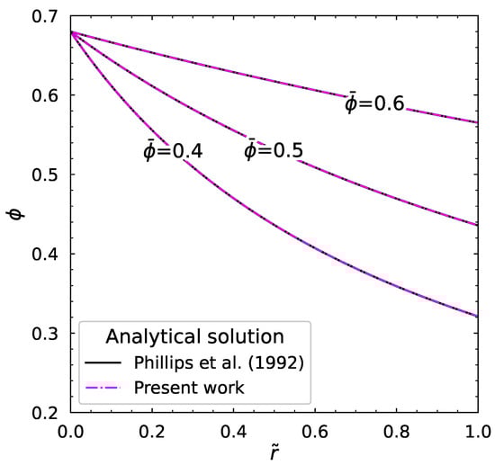 Figure 5. The analytical and numerical solutions of particle volume fraction distribution for different  ϕ ¯  [6].