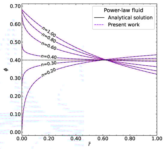 Figure 16. Effect of n. Input values used for the simulation: R = 0.01 m,  ϕ m  = 0.68,  α  = 0.66,  η  = 100 Pa·s,  η 0  = 1400 Pa·s,  λ  = 1.6 s, a = 1.25,  d p d z  = 0.6 MPa/m,  ϕ ¯  = 0.30.