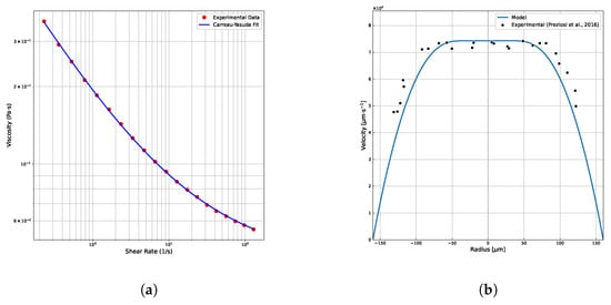 Figure 7. Experimental validation of the numerical model. (a) Carreau–Yasuda model fit to experimental viscosity data from [19]. (b) Comparison of velocity profiles: experimental data (dots) vs. model prediction (solid line).