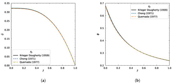 Figure 8. The velocity and concentration profiles using various relative viscosity models [20,21,22]. (a) The velocity profiles for various  η r  models. (b) The concentration profiles for various  η r  models.