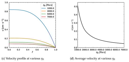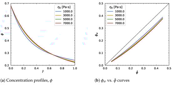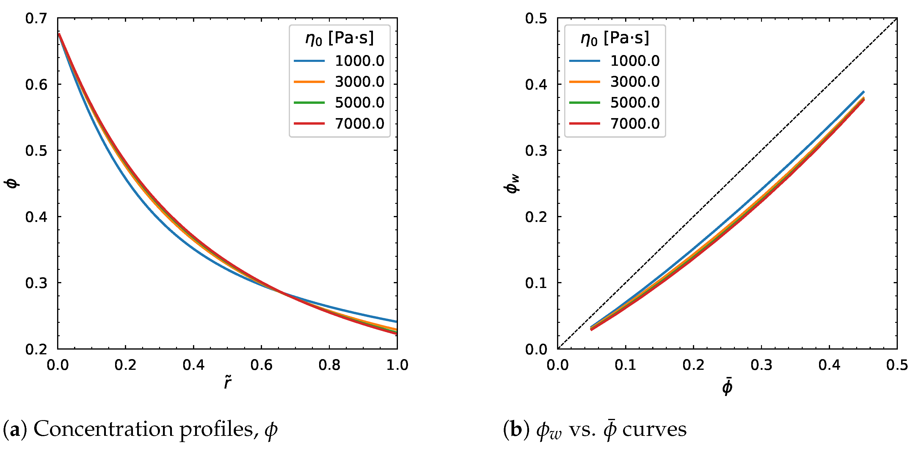 Figure 13. Effect of  η 0 . Input values used for the simulation: R = 0.01 m,  ϕ m  = 0.68,  α  = 0.66,  η  = 100 Pa·s,  λ  = 1.6 s, a = 1.25, n = 0.5,  d p d z  = 0.6 MPa/m,  ϕ ¯  = 0.30.