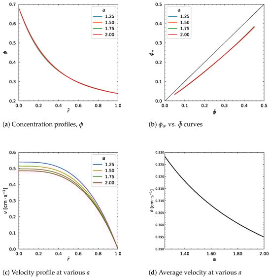 Figure 14. Effect of a. Input values used for the simulation: R = 0.01 m,  ϕ m  = 0.68,  α  = 0.66,  η  = 100 Pa·s,  η 0  = 1400 Pa·s,  λ  = 1.6 s, n = 0.5,  d p d z  = 0.6 MPa/m,  ϕ ¯  = 0.30.