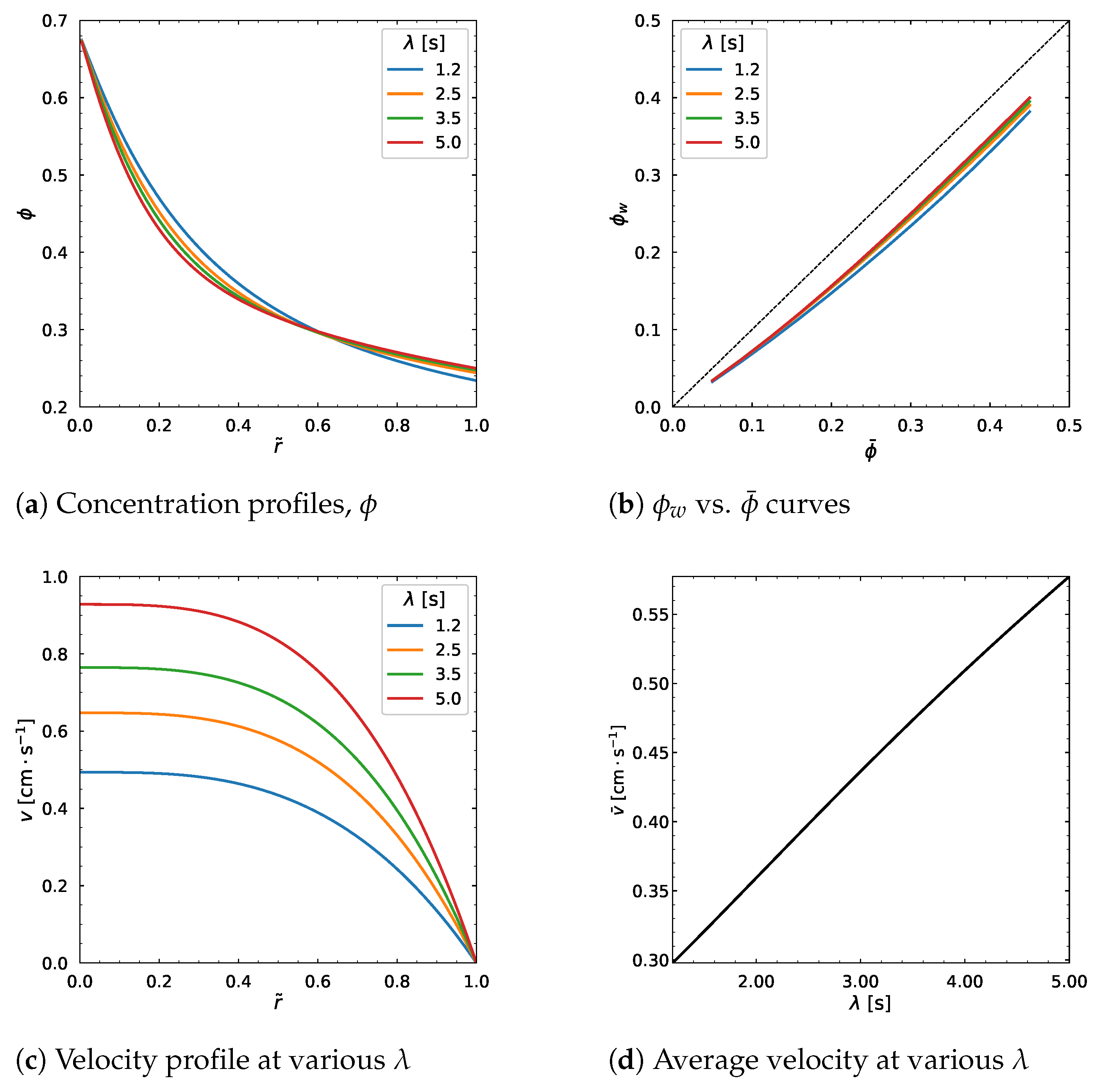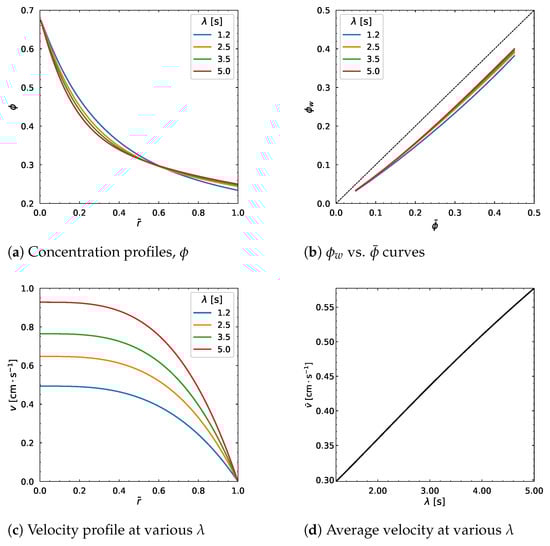 Figure 15. Effect of  λ . Input values used for the simulation: R = 0.01 m,  ϕ m  = 0.68,  α  = 0.66,  η  = 100 Pa·s,  η 0  = 1400 Pa·s, a = 1.25, n = 0.5,  d p d z  = 0.6 MPa/m,  ϕ ¯  = 0.30.