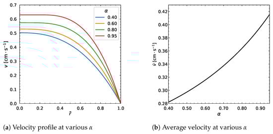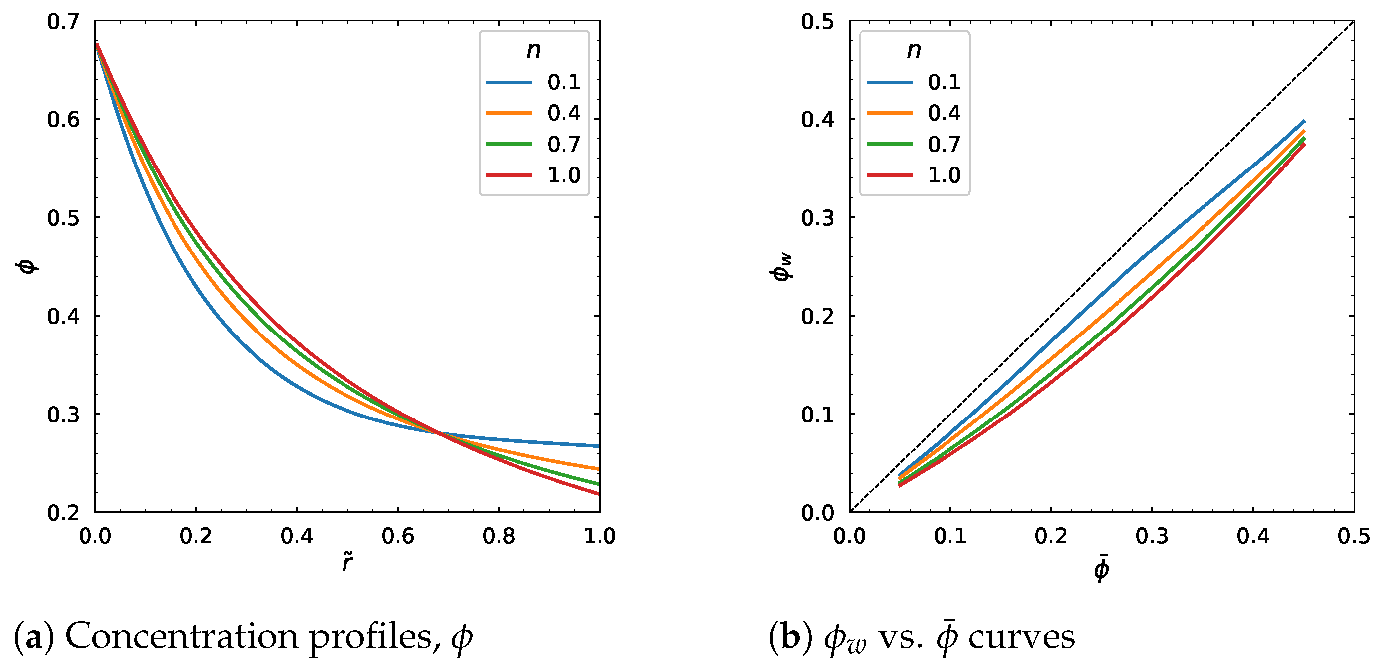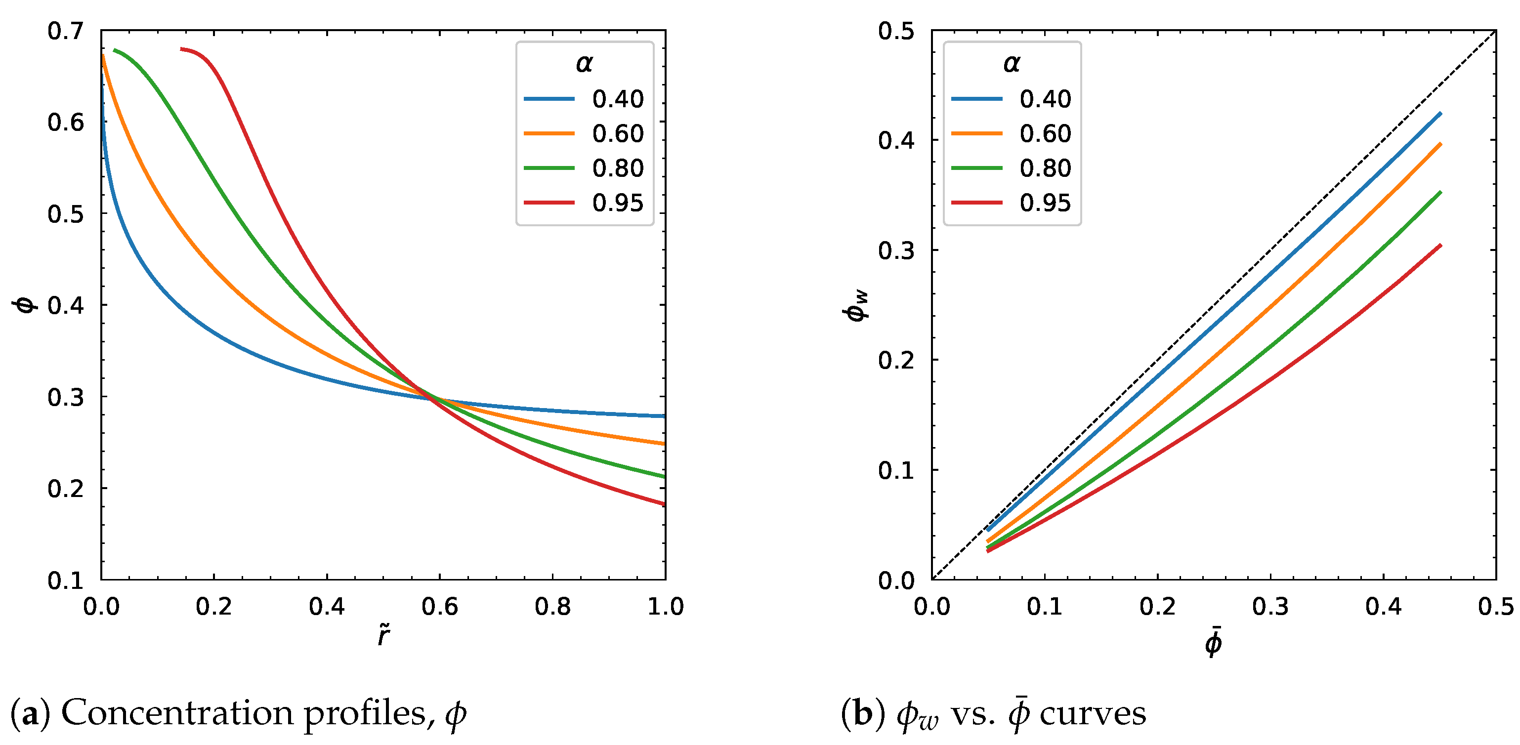 Several related studies have examined particle migration in different flow configurations. Choi et al. [15] studied concrete pumping in pipes using the Bingham fluid model for the viscosity–shear rate relation and commercial CFD software (Fluent) for numerical solutions. Siqueira and Carvalho [16] investigated particle migration in planar extrudate flows of suspensions of hard spheres. They analyzed Newtonian flows between parallel plates and subsequent free-surface extrudate flows, employing a stabilized finite element method along with elliptic mesh generation to compute the free surface. Rebouças et al. [17] studied fully developed suspension flows in circular tubes, focusing on the effects of particle and shear-induced viscosity. Their work is closely related to ours, as they also solved the shear-induced diffusion equation for non-Newtonian flows. They examined the effects of the average particle volume fraction on concentration and velocity profiles, and their results agree qualitatively with our findings. However, their approach addressed the singularity near the tube centerline and relied on the Cross model for fluid viscosity, whereas we adopt the more general Carreau–Yasuda model, which includes an additional parameter (a). Furthermore, we systematically explore the influence of a broader set of parameters, including the pressure gradient, average particle volume fraction, all five Carreau–Yasuda parameters, and the model parameter  K c / K η  (hereafter  α ).