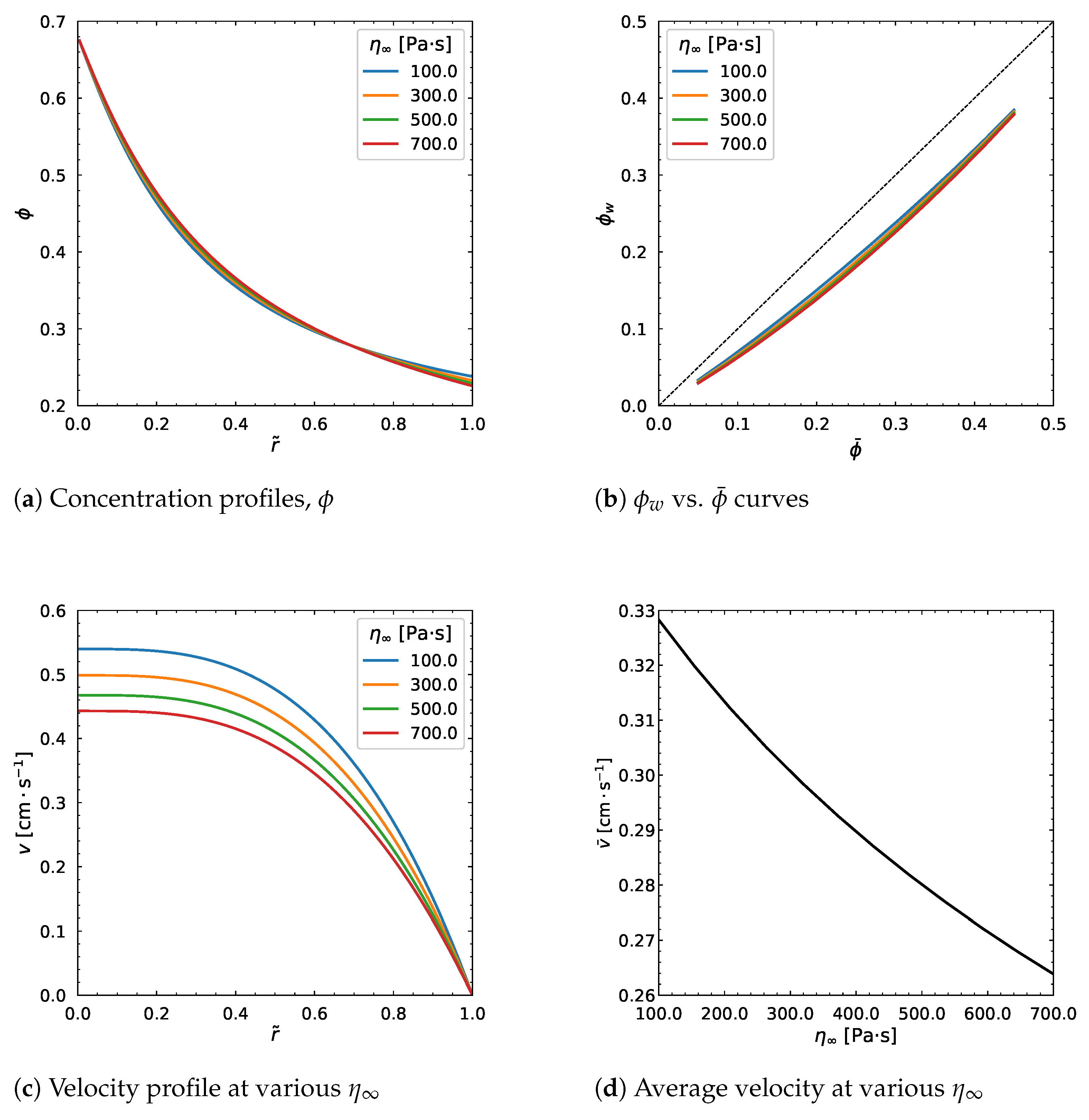 The work of Phillips et al. [6] provides a fundamental reference for this study. They derived the shear-induced diffusion equation for the particle volume fraction ( ϕ ) and established the corresponding no-flux boundary condition. A key difference between our work and theirs is that Phillips et al. assumed Newtonian fluids in Couette and Poiseuille flows, whereas we consider non-Newtonian flows governed by the Carreau–Yasuda model [7].