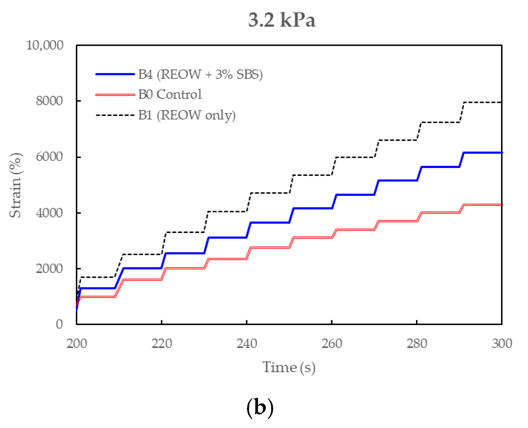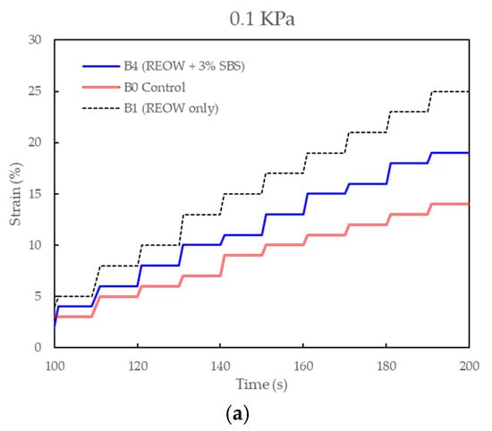 MSCR tests were performed in accordance with ASTM D7405 [32] to evaluate high-temperature deformation resistance and elastic recovery of the modified binders. Tests were conducted at 3.2 kPa and 0.1 kPa stress levels, capturing both stress sensitivity and polymeric recovery behavior.