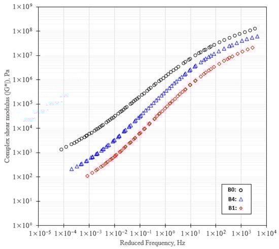 Rheological characterization was conducted using a Dynamic Shear Rheometer (ASTM D7175 [31]) (Figure 3a), including temperature sweep tests (46–82 °C) to determine complex shear modulus (G*). Frequency sweep tests (0.1–100 rad/s) were further used to construct master curves using time–temperature superposition, providing detailed insight into binder viscoelasticity, stiffness evolution, and temperature susceptibility across modification levels.
